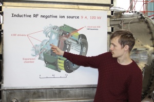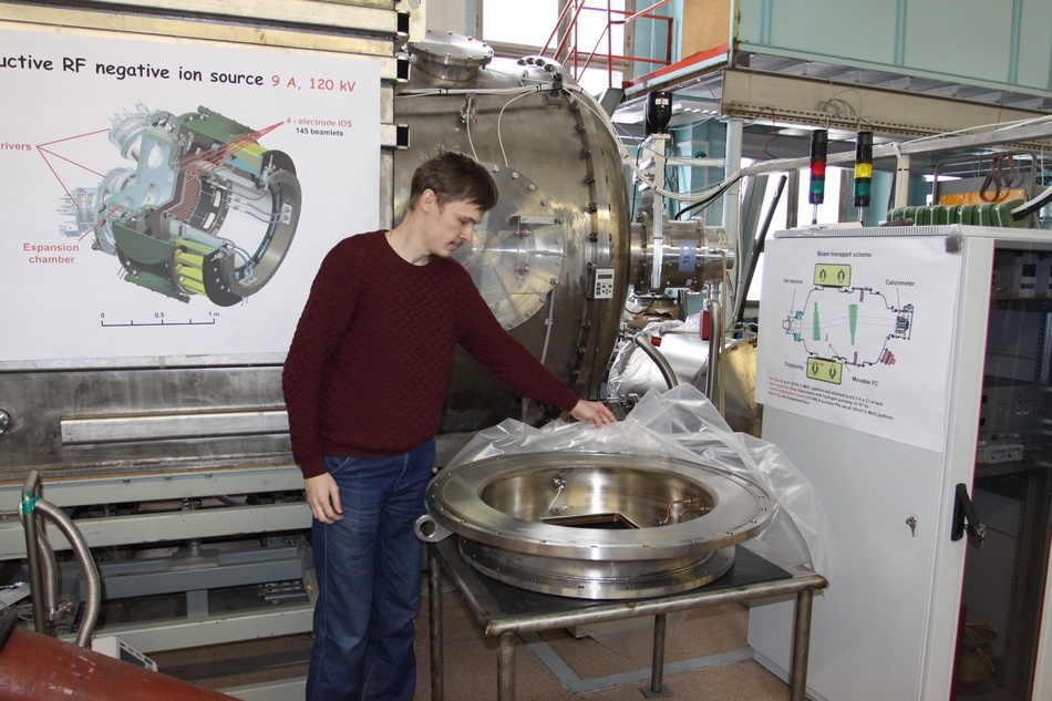 «Источником и ускорителем ионов занимается большая команда, – пояснил Олег Сотников, – я участвовал в его сборке, а сейчас моя часть работы заключается в подготовке экспериментов, их планировании и запуске ионного источника. В начале рабочего дня производится запуск основных систем: питания ВЧ разряда и высоковольтных выпрямителей. Затем постепенно увеличивается мощность, вкладываемая в плазму разряда и ток пучка, а также энергия пучка отрицательных ионов. Далее следует запланированный эксперимент – исследуются эмиссионные характеристики источника отрицательных ионов, формирование и транспортировка пучка».