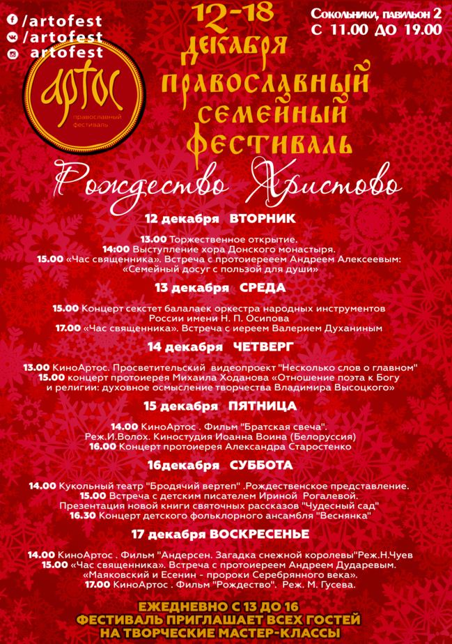 Приятными хлопотами подготовки к зимним праздникам фестиваль «Артос» предлагает насладиться с пользой для души: всех посетителей ждёт насыщенная культурная программа. Здесь пройдут встречи с известными проповедниками, где можно будет задать вопросы о посте и подготовке к Рождеству Христову, а также серия кинопоказов, знакомящих с его духовным смыслом. А любителям чтения организаторы приготовили презентации новинок православной литературы и возможность встретиться и пообщаться с их авторами.
