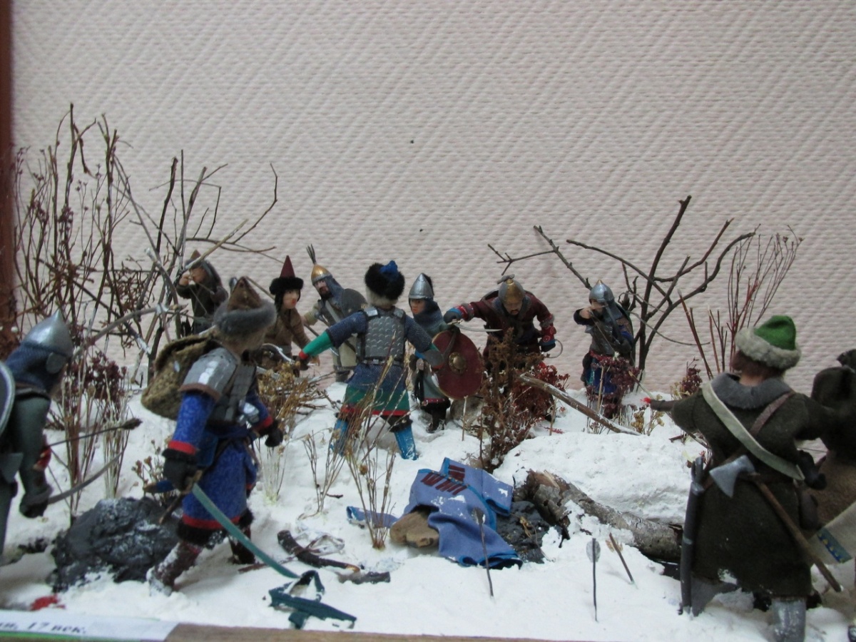 Посетители увидят на выставке масштабные исторические миниатюры из жизни казаков и сибирских кыргызов, солдата горнизона Умревинского острога, вооруженного секирой, редкие предметы крестьянского быта, фигурки стрелецкого головы, сотника, вооруженного протозаном и саблей, стрельца, вооруженного бердышом и пищалью, изделия мошковских умельцев.