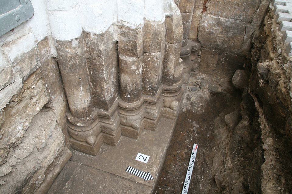 В 1930-1950 годах археолог Николай Николаевич Воронин во время раскопок открыл основания древнего храма Рождества Богородицы с юга и запада, а также обнаружил основания столбов в южной части внутри храма и основание продолжения северного перехода, южного перехода, водосвятной чаши, а также башни или дворцового сооружения на южном склоне холма. Выяснилось, что нижние ряды белокаменной кладки из хорошо отесанных каменных блоков украшены профилированным цоколем, на выступающих частях которого стоят основания круглых колонок, украшавших фасад. Эти раскопки впервые доказали, что современная церковь стоит прямо на сохранившейся в неприкосновенности нижней части древнего храма. Ученый составил аксонометрический план, описал внешний вид основания углов лестничной башни и основания стен башни: он впервые отметил, что базы колонн имеют сложный рисунок и предположил, что зодчими храма могли быть западные мастера. Но впоследствии раскоп был засыпан, основания были по-прежнему скрыты толстым слоем земли, и свидетельством того, что когда-то у храма были развитые основания, стал лишь сделанный ученым чертеж. На сегодняшний день увидеть древние основания можно лишь в открытым музеефицированном раскопе в западной части собора.