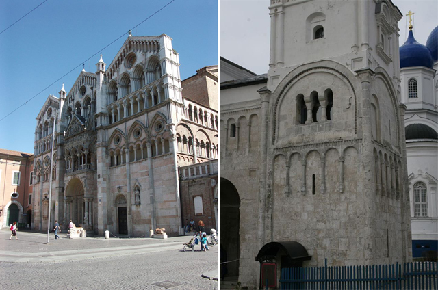 На первый «адрес» мастеров, работавших на строительстве храма, указали угловые колонны храма, поставленные по диагонали: подобные колонны есть в соборах Северной Италии: например, в Кафедральном соборе Модены (католический собор в Эмилии-Романья, Италия, включен в список объектов Всемирного наследия ЮНЕСКО) и в Кафедральном соборе Феррары (Эмилия-Романья, Италия). Второй «адрес» мастеров дали полуколонны на стенах храма в Боголюбове, дополненные по сторонам малыми колонками. Подобные формы встречаются в итальянских храмах, например, в базилике Сан-Микеле в Павии.
