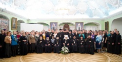 Церковно-археологический кабинет Московской духовной академии празднует 130-летний юбилей25 ноября 2010 года Церковно-археологический кабинет Московской духовной академии отметил своё 130-летие. 8 октября 1871 г. в помещениях академической библиотеки организуется музей, основу коллекции которого составили книги и иконы, выделенные Святейшим Синодом. 21 сентября 1880 года – указ Святейшего Синода об учреждении Церковно-археологического музея при МДА. 1892 год – музей переведён в Актовый зал Царских чертогов. 1950 г. – возрождение Церковно-археологического кабинета при МДА по благословению Святейшего Патриарха Алексия I (Симанского). 25 ноября – день ЦАКа, установлен прот. Алексием Остаповым по благословению Святейшего Патриарха Алексия I (Симанского). Юбилей решили отпраздновать встречей-конференцией, на которую в качестве участников и гостей были приглашены все бывшие сотрудники Церковно-археологического кабинета и друзья музея. Девизом юбилейной конференции стали слова, подчёркивающие связь времён: «Сохранять. Приумножать. Просвещать». По благословению Высокопреосвященного Евгения, ректора Московской духовной академии, сотрудники ЦАКа: заведующий протодиакон Игорь Михайлов, помощник заведующего Варежкин Александр, хранители ЦАКа Суворова Евгения и Ершова Наталья подготовили юбилейное мероприятие. Во время подготовки конференции была проведена большая работа: из фотоматериалов архива ЦАКа подготовлена ретроспектива; создана презентация экспозиции музея; составлены и выверены списки всех тех, кто работал в ЦАКе за последние 50 лет. Во многом в подготовке конференции помогли старожилы Церковно-археологического кабинета: Г. П. Владимирова, Т. Д. Гулидова, А. Б. Апанович, которые всем сердцем радеют о его жизни, о сохранении и приумножении коллекции. Целью данной конференции стало восстановление единства хронологических событий в жизни музея, начиная с заведующего прот. Алексия Остапова и до наших дней. Это стало возможным лишь благодаря встрече всех ветеранов музея под сводами Царских чертогов, где и расположился ЦАК после своего возрождения. День конференции начался с литургии в Покровском академическом храме и литии по почившим основателям и сотрудникам ЦАКа. После регистрации участников заведующий ЦАКом протодиакон Игорь Михайлов и хранитель ЦАКа Суворова Евгения приветственным словом открыли конференцию. Со словами приветствия к участникам конференции обратился архиепископ Верейский Евгений, председатель Учебного комитета РПЦ, ректор Московских духовных академии и семинарии. С поздравительным адресом выступили – начальник департамента по взаимодействию с политическими партиями, общественными и иными организациями Аппарата Полномочного Представителя Президента Российской Федерации по Центральному Федеральному округу Белогубова М. Н.; заместитель генерального директора Сергиево-Посадского государственного историко-художественного музея-заповедника Суббота Г. И. Преподаватель Киевской духовной академии игумен Сильвестр (Стойчев) выступил со словами приветствия к участникам конференции от архиепископа Бориспольского Антония, председателя Учебного комитета УПЦ, ректора Киевских духовных академии и семинарии. ЦАК приехали поздравить с юбилеем представители церковных музеев: Писаренко О.А., храните