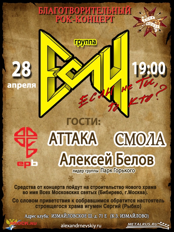 РОКЕРЫ – ВОСКРЕСШЕМУ ХРИСТУ28 апреля в клубе Rock-House (Измайловское шоссе, д. 71 Е (КЗ Измайлово)) состоится благотворительный Пасхальный рок-концерт, все средства от которого музыканты пожелали перечислить на строительство храма во имя Всех Московских святых в Бибиреве (г.Москва). Организатор и хэд-лайнер концерта – хард-рок группа «Если» http://www.esly.ru, участвуют: Алексей Белов («Парк Горького»), «Аттака», «Смола», «Ерь». Храм во имя Московских святых строится исключительно на народные деньги – средства прихода и пожертвования простых людей из Москвы и со всех концов России. Православные рок-музыканты решили внести свой вклад в эту историческую, крупнейшую в настоящее время стройку Москвы. Ранее пожертвование на строительство храма внесла рок-группа «Воскресение». Со словом приветствия и благовестия к собравшимся обратится настоятель строящегося храма, известный миссионер, друг всех неформалов и рокеров игумен Сергий (Рыбко). Отец Сергий, глубоко любящий и понимающий русскую молодежь священник, как всегда скажет живое и интересное пасхальное слово. Концерт проходит при поддержке продюсерского центра «Александр Невский».