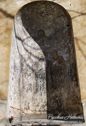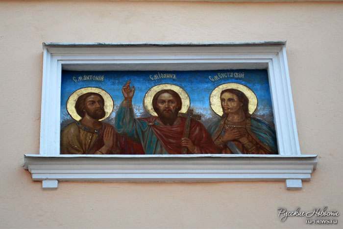 Фреска святых Виленских мучеников Антония, Иоанна и Евстафия над входом в вильнюсский храм Святого Духа. 2011.04.27.