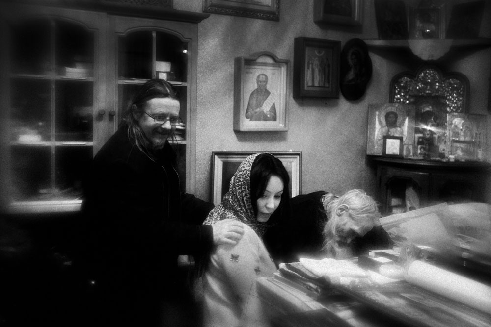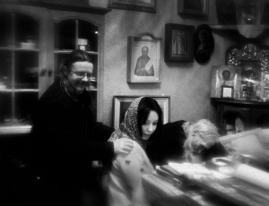 Дверь открывается, и в коридор выходит худой согнутый старичок. Его седая борода свисает до пояса черной рясы. Он делает шаг к скамейке, женщины вскакивают, сложив ладони для благословения.