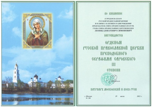 Патриарх наградил Симоновича Леонида Донатовича (главу Союза Православных Хоругвеносцев) орденом Св. Преподобного Серафима СаровскогоВо внимание к трудам на благо Русской Православной Церкви и в связи с 65-летием со дня рождения Председатель Союза Православных Братств, Глава Союза Православных Хоругвеносцев Леонид Донатович Симонович награждается Орденом Св. Преподобного Серафима Саровского III Степени. Патриарх Кирилл наградил орденом лидера православных хоругвеносцев Москва. 16 августа. ИНТЕРФАКС - Председатель Союза православных братств и Союза православных хоругвеносцев Леонид Симонович-Никшич удостоен ордена преподобного Серафима Саровского (III степени). Награда присуждена во внимание к трудам на благо Русской церкви и в связи с 65-летием со дня рождения. Орден от имени патриарха Кирилла вручил глава синодального Отдела по взаимоотношениям Церкви и общества протоиерей Всеволод Чаплин, сообщает сайт ОВЦО. Церемония состоялась в воскресенье, в праздник Происхождения (Изнесения) Честных Древ Животворящего Креста Господня, по окончании Божественной литургии в московском храме Святителя Николая на Трех горах. В своем слове отец Всеволод отметил, что Л.Симонович-Никшич многие годы трудится на благо Церкви, достойно представляя позицию православной общественности по различным злободневным вопросам и при этом храня верность единству Церкви и послушание ее священноначалию. В настоящее время Л.Симонович-Никшич отстаивает в суде лозунг "Православие или смерть", который ранее был признан Черемушкинским судом Москвы экстремистским. Хоругвеносцы активно используют этот слоган: их художественная мастерская-студия предлагает футболки с такой надписью. Многие эксперты и священники видят в запрете слогана его неверную трактовку, поясняя, что он имеет глубокий богословский смысл.