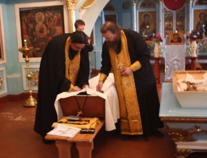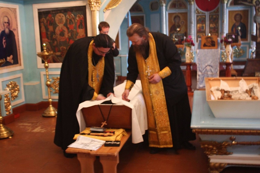 10 сентября - переоблачение останков прп. иеромонаха Пафнутия Балахнинского10 сентября 2011 года в соборном храме в честь Рождества Христова города Балахны наместник нижегородского Благовещенского мужского монастыря, настоятель Никольского храма Покровского мужского монастыря игумен Александр (Лукин) с братией и священнослужителями Балахнинского благочиния совершил облачение и положение во гроб останков основателя Балахнинского Покровского мужского монастыря иеромонаха Пафнутия. В июне 1999 года по благословению митрополита Нижегородского и Арзамасского Николая в подклети Никольского храма на месте, где, по документальным данным, находилась могила, были произведены раскопки, в результате которых обнаружены останки иеромонаха Пафнутия. По благословению митрополита Николая останки были положены в раку в соборном храме в честь Рождества Христова. В феврале 2011 года архиепископ Нижегородский и Арзамасский Георгий в ходе архипастырского визита в Балахну посетил Покровский монастырь. По его благословению было решено перезахоронить останки иеромонаха Пафнутия в подклети Никольского храма в воссоздаваемой Покровской обители. Перезахоронение останков преподобного иеромонаха Пафнутия Балахнинского, основателя Покровского мужского монастыря г. Балахны произойдет 19 ноября 2011 года после Божественной Литургии, которую возглавит архиепископ Нижегородский и Арзамасский Георгий. Преподобне отче Пафнутие моли Бога о нас!