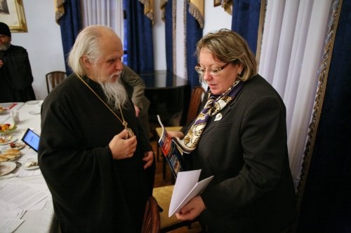 Епископ Пантелеимон дарит журнал "Нескучный сад" первому заместителю руководителя Департамента социальной защиты населения Москвы Ольге Грачевой