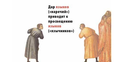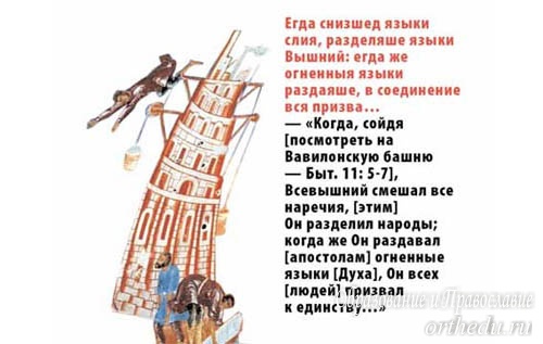 Священная игра слов. На каких языках заговорили апостолыРождению Церкви содействовало двойное чудо: сошествие Святого Духа на апостолов в виде огненных языков и дарование им возможности проповедовать на различных языках и быть услышанными всеми народами. Как это событие преломляется в песнопениях праздника, рассказывает ведущий рубрики диакон Михаил АСМУС в журнале «Нескучный сад» center] Премудрые ловцы Десять дней после вознесения Господня апостолы ожидали того, когда они будут облечены силою свыше, чтобы стать свидетелями и проповедниками покаяния и прощения грехов во имя Христово во всех народах (Лк. 24: 47-49). Им было обещано Христом послание другого Утешителя, т. е. «Заступника, Ходатая», вместо Себя — Духа истины, Который от Отца исходит (Ин. 15: 26). Но они не могли и предположить, что первым даром Святого Духа будет дар говорения на иностранных языках (греч. «глоссолалия»), необходимый для проповеди даже до последних, т. е. «до крайних пределов», земли (Деян. 1: 8). То, что это были именно иностранные языки, а не какая-то нечленораздельная речь, практикуемая нынче в некоторых «харизматических» сектах, свидетельствуют, помимо апостольских Деяний и Посланий, многие песнопения праздника. Например, 2-я стихира на вечерне: Языками инородных («иноплеменников») обновил еси, Христе, Твоя ученики, да теми (т.е. «на этих языках») Тя проповедят Безсмертнаго Слова и Бога, подающаго душам нашим велию милость. Чудо состояло еще и в том, что говорить на языках стали люди неученые. Простые галилейские рыбаки в одночасье превратились в убедительных ораторов, тонких психологов и возвышенных богословов, ловящих в сети своей проповеди умы и сердца людей самой различной степени развития. Об этом говорится и в тропаре Пятидесятницы: Благословен еси, Христе Боже наш, Иже премудры ловцы явлей («Показавший рыбаков мудрецами»), ниспослав им Духа Святаго, и теми уловлей вселенную («и ими уловивший весь мир»): Человеколюбче, слава Тебе! Домостроительство Духа От Пятидесятницы и доныне Святой Дух постоянно животворит Церковь, таинственно наполняя Собою жизнь ее членов. Но это не означает, что Он не действовал в истории раньше. О Духе Божием, носящемся над водою в момент творения мира, мы узнаем из самых первых строк книги Бытия (1: 2). В Ветхозаветный период Дух наиболее явственно проявлял Себя в пророках, через них наставляя людей на путь спасения, и в священниках, через них подавая освящение. О домостроительстве Святого Духа в истории мира напоминает 3-я стихира на вечерне: Вся подает Дух Святый: точит пророчествия, священники совершает, некнижныя мудрости научи, рыбари богословцы показа, весь собирает собор церковный… — «Всё подает Дух Святой: источает пророчества, посвящает священников, безграмотных [апостолов] научил мудрости, рыбаков сделал богословами, составляет всё устроение Церкви…». Присутствие Святого Духа в жизни церковных людей представляется настолько необходимым, что в начале всякого богослужебного последования, молитвенного правила и вообще всякого доброго дела произносится единственная в своем роде стихира Пятидесятницы, обращенная к Самому Святому Духу: Царю небесный, Утешителю, Душе истины, Иже везде сый и вся исполняяй, Сокровище благих и жизни Подателю. Прииди и вселися в ны, и очисти ны от всякия скверны, и спаси, Блаже, души наша. — «Ца