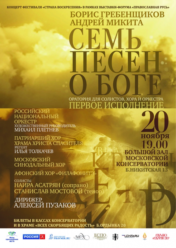Оратория «СЕМЬ ПЕСЕН О БОГЕ»Москва, 16 ноября. 20 ноября в 19.00 ч. в Большом зале Московской Консерватории состоится премьера оратории «Семь песен о Боге» композитора Андрея Микиты на стихи Бориса Гребенщикова. В основу оратории положены музыкальные темы семи песен группы «Аквариум»: «Господу видней», «Обещанный день», «Серебро Господа моего», «Еще один раз», «Сокол», «Дубровский», «День радости». Борис Гребенщиков дал согласие на использование его авторских текстов и мелодий и планирует присутствовать на премьере. Почему именно оратория? По словам Андрея Микиты, ораториальные средства позволяют заострить внимание на ключевых моментах текста в отличии от песни, где задано состояние, настроение, но нет возможности остановиться на деталях. Оратория – это, прежде всего, хор и симфонический оркестр. Хор – самый древний музыкальный инструмент. Симфонический оркестр - венец четырехвекового развития европейской музыки. Оратория «Семь песен о Боге» - синтез многовековой традиции и современной русской культуры. Концерт организован Фондом содействия возрождению Синодального хора, при поддержке Фонда просвещения МЕТА. В концерте примут участие: Российский национальный оркестр Патриарший хор Храма Христа Спасителя Московский Синодальный хор Афонский хор «Филафонитэ» (Греция) Солисты: Станислав Мостовой (тенор) и Наира Асатрян (сопрано) Дирижер – заслуженный артист России Алексей Пузаков Начало концерта в 19.00 ч., Большой зал Консерватории (ул. Б.Никитская, 13) Аккредитация журналистов: sempesen@mail.ru или по телефону СИНФО +7 (495) 781-97-61 доб. 121 -- Синодальный информационный отдел Московского Патриархата