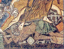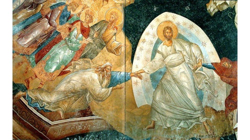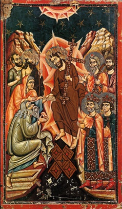 Иконография Воскресения ХристоваНа византийских и древнерусских иконах Воскресения Христова никогда не изображается сам момент Воскресения. На них изображается «сошествие Христа во ад», а точнее, то, как Христос выводит из ада Адама, Еву и других героев библейской истории; под ногами Спасителя — черная бездна преисподней, на фоне которой — замки, ключи и обломки врат, некогда преграждавших мертвым путь к воскресению. Именно этот иконографический тип является каноническим, так как отражает традиционное учение о сошествии Христа во ад, победе Его над смертью, воскрешении Им мертвых и изведении их из ада, в котором они содержались до Его Воскресения. В последние несколько веков при создании образа Воскресения Христова использовались и другие сюжеты, в частности, заимствованный из западной традиции образ воскресшего Христа, выходящего из гроба и держащего в руках знамя победы . Однако этот образ не традиционен для Православия. Каждое православное иконописное изображение основано на том или ином литургическом воспоминании. Не существует икон или фресок, сюжет которых не соотносился бы с тем или иным днем церковного календаря. Икона Сошествия во ад соответствует литургическому воспоминанию Великой субботы и Пасхи. Само учение о Сошествии во ад основано на нескольких текстах из Священного Писания, прежде всего на послании апостола Петра: «Христос, чтобы привести нас к Богу, однажды пострадал за грехи наши, Праведник за неправедных, быв умерщвлен по плоти, но ожив духом, Которым Он и находящимся в темнице духам, сошед, проповедал…» (1 Пет. 3, 18-19). Но гораздо подробнее тема сошествия Христа во ад, отраженная также в иконописи, раскрывается в раннехристианской апокрифической литературе. Есть иконография, где Христос попирает даже не врата ада, а сам ад в виде персонифицированного образа — связанного старика в кандалах, и над ним стоит Господь, покоривший его. Тема персонификации ада, смерти берет начало именно в апокрифах. В дошедшем до нас апокрифическом тексте V века «Евангелие Никодима» (не противоречащем православному учению, хотя и не вошедшем в церковный канон) центральное место занимает диалог между сатаной и адом. Ад пытается воспротивиться пришествию Христа и приказывает своим демонам «твердо заключить врата медные и запоры железные» и крепко держать «заклепы». Но раздается голос: «Поднимите врата». Услышав этот голос, ад спрашивает: «Кто есть Сей Царь славы?» Ангелы говорят: «Господь крепкий и сильный, Господь сильный в брани». И тотчас медные врата сокрушаются, железные засовы ломаются, и все связанные мертвецы разрешаются от уз. Царь славы связывает сатану и предает его аду со словами: «Держи его крепко до второго Моего пришествия». Приняв сатану, ад говорит ему: «Обратись и посмотри, что у меня не осталось ни одного мертвеца». Далее описывается изведение умерших из ада воплотившимся Христом: «Царь славы простер десницу Свою и взял и воздвиг праотца Адама. Потом, обратясь к прочим, сказал: "Сюда, за Мною, все, умерщвленные древом, к которому он прикоснулся. Я опять всех вас воскрешаю древом креста”. И потом Он стал всех изводить вон… Когда же Он шел, блаженные отцы, следуя за Ним, воспевали, говоря: "Благословен грядущий во имя Господне; аллилуиа; ему слава всех святых”». «Евангелие Никодима» содержит в себе все идеи и о