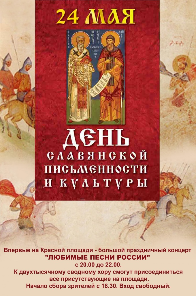 В 20.00 на Красной площади состоится большой праздничный концерт «Наши любимые песни», к участию в котором приглашаются все желающие. Мероприятие откроется приветственным словом Святейшего Патриарха Московского и всея Руси Кирилла.