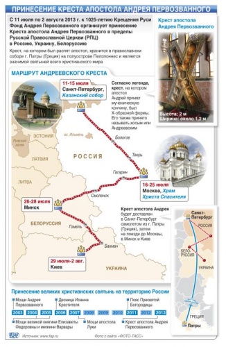 В пределы Русской Православной Церкви будет принесен Крест апостола Андрея ПервозванногоМосква, 9 июля. По благословению Святейшего Патриарха Московского и всея Руси Кирилла и по согласованию со Священным Синодом Элладской Православной Церкви с 11 июля по 2 августа 2013 года в пределы Русской Православной Церкви будет принесен Крест апостола Андрея Первозванного. Принесение святыни в Россию, Украину и Белоруссию, приуроченное к празднованию 1025-летия Крещения Руси, осуществляется Фондом Андрея Первозванного при поддержке благотворительной организации Элладской Православной Церкви «Апостоли». Крест, на котором был распят апостол, хранится в Андреевском кафедральном соборе города Патры (Греция) на полуострове Пелопоннес и является значимой святыней всего христианского мира. График принесения Андреевского креста: 11 - 15 июля — Казанский кафедральный собор г. Санкт-Петербурга 16 - 17 июля – Храм св. Георгия Победоносца города Одинцово Московской области 17 - 19 июля – Успенский собор города Дмитрова Московской области 19 - 26 июля – Кафедральный Соборный Храм Христа Спасителя, Москва 26 - 28 июля — Киев 29 июля — 2 августа — Минск Принесение Креста святого апостола в Санкт-Петербург, Москву, Киев и Минск призвано подчеркнуть, что духовная традиция народов России, Украины и Белоруссии восходит к единому источнику — благословению, данному апостолом Андреем в ходе его миссионерского посещения пределов Руси, и к Крещению, принятому русичами в киевской купели в 988 году. Для получения аккредитации необходимо оформить заявку согласно образцу в приложении. Аккредитация СМИ по электронной почте: kad@sinfo-mp.ru до 16.00 15 июля. Справки по тел.: +7 (495) 781-97-61 доб. 121 и +7-916-499-65-29, Мария.