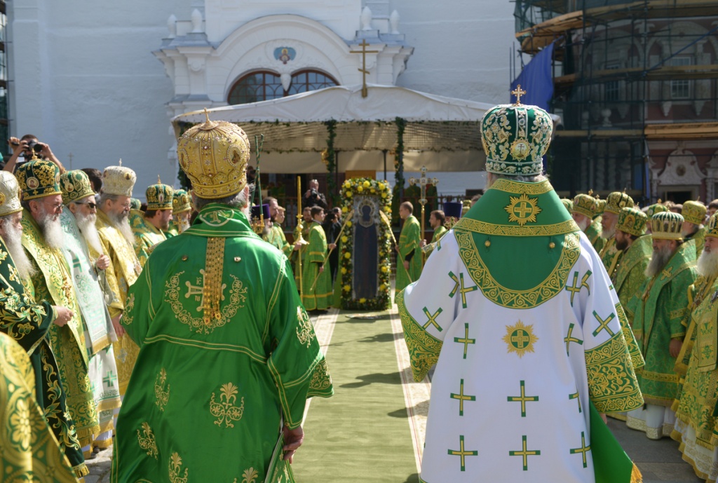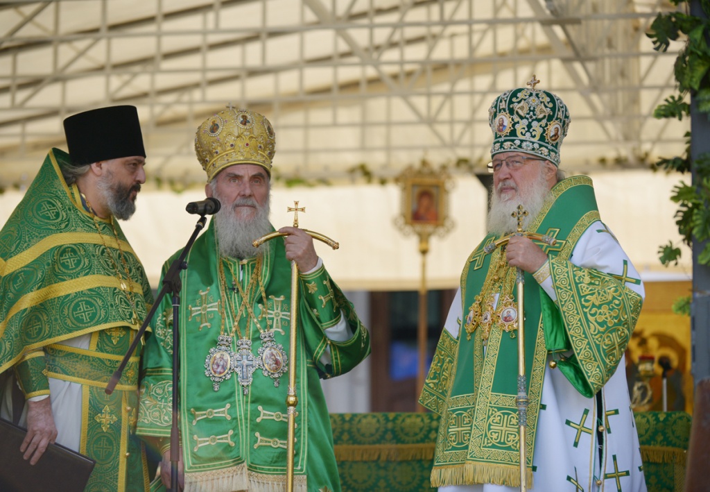 В праздник обретения мощей преподобного Сергия Радонежского Предстоятели Русской и Сербской Православных Церквей совершили Литургию на Соборной площади Троице-Сергиевой лавры18 июля 2013 года, в праздник обретения честных мощей преподобного Сергия, игумена Радонежского, Святейший Патриарх Московский и всея Руси Кирилл и Святейший Патриарх Сербский Ириней совершили Божественную литургию на площади перед Успенским собором Свято-Троицкой Сергиевой лавры, где был установлен престол под сенью. Литургия на Соборной площади совершалась впервые в истории лавры. За богослужением пел хор Троице-Сергиевой лавры под управлением архимандрита Глеба (Кожевникова). На малом входе в связи с образованием Владимирской митрополии Святейший Патриарх Кирилл возвел архиепископа Владимирского и Суздальского Евлогия в сан митрополита. В связи с занимаемой должностью секретарь администрации приходов Московского Патриархата в Италии иеромонах Антоний (Севрюк) был возведен в сан архимандрита. Проповедь перед причастием произнес архимандрит Илия (Рейзмир), насельник Свято-Троицкой Сергиевой лавры. По окончании Литургии Святейший Патриарх Кирилл и Святейший Патриарх Ириней совершил молебен на Соборной площади лавры перед чтимой иконой преподобного Сергия Радонежского. Предстоятелям сослужил собор иерархов, совершавших сегодня Литургию в храмах Троице-Сергиевой лавры. В Троицком соборе Божественную литургию возглавил управляющий делами Московской Патриархии митрополит Саранский и Мордовский Варсонофий, в Сергиевском трапезном храме — митрополит Крутицкий и Коломенский Ювеналий, в Духовском храме — митрополит Рязанский и Михайловский Павел, в Покровском академическом храме — председатель Издательского Совета Русской Православной Церкви митрополит Калужский и Боровский Климент, в храме преподобного Иоанна Лествичника — глава Среднеазиатского митрополичьего округа митрополит Ташкентский и Узбекистанский Викентий, в Черниговском скиту — митрополит Брянский и Севский Александр. После молебна Святейший Патриарх Кирилл приветствовал Святейшего Иринея. Предстоятель Сербской Церкви обратился с ответным словом: «Благодарю Вас, Возлюбленный Собрат, за то, что пригласили меня на это великое торжество братской Русской Церкви. Праздник преподобного Сергия — один из главных на Руси, и для меня особая честь побывать в России именно в эти святые дни, иметь радость молитвы с Вашей Святыней в самый торжественный для Вас и Вашей паствы праздник. Житие преподобного Сергия многому способно научить любого верующего человека, неважно, в какой части света он живет и на каком языке говорит. Это житие понятно любому. Чета благочестивых супругов молила Бога и обрела сына, в котором собрались добродетели родителей и всей той земли, в которой он рос. Вот она, похвала честного супружества! Писание глаголет: "Если начаток свят, то и целое; и если корень свят, то и ветви" (Рим. 11:16). Духа Святого преподобный Сергий исполнился еще от чрева матери своея, и настолько неотмирной была жизнь этого ребенка, что даже грамоте научился он не от человека, а действием Ангела, посланного ему Богом. Возмужав, он все свои силы посвятил Господу Иисусу Христу. Так и всякий русский человек, и всякий серб должен поступать — лучшие силы отдавать Богу. Ибо "где сокровище ваше,