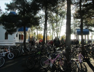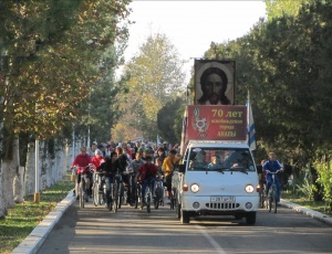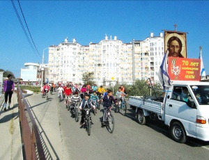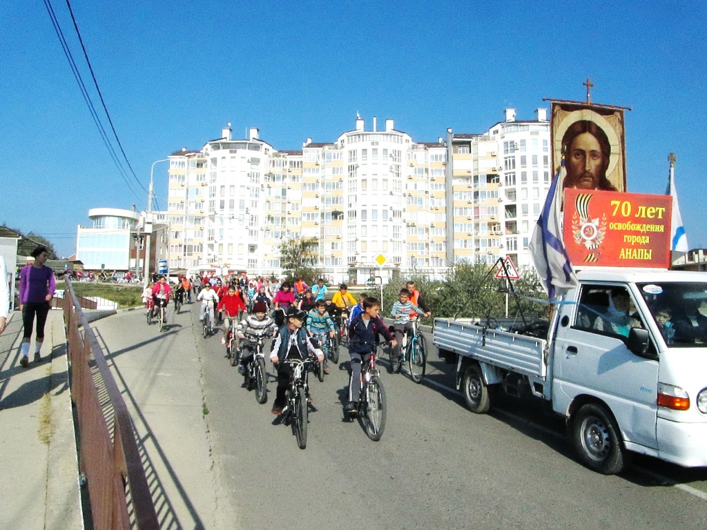 Вело-Покровский крестный ход в память о героях14 октября в Анапе в праздник Покрова Пресвятой Богородицы по благословению епископа Новороссийского и Геленджикского Феогноста состоялся уже двенадцатый по счету традиционный Крестный ход на велосипедах. В 2013 году велосипедисты провели Крестный ход под знаком 70-летия освобождения Анапы и всей Кубани от немецко-фашистских захватчиков. Традиционным маршрутом крестоходцы проехали по городу от нового храма преподобного Серафима Саровского по Пионерскому проспекту до Батареи Славы, где узнали о подвиге защитников Анапы, стоявших на смерть у пос. Витязево и почтили героев молитвенным поминовением. Затем участники прибыли в часовню преподобного Серафима Саровского в санатории «Жемчужина России», где после приветствия руководства санатория и выступления детей, воспитанников православной школы «Преображение», были отслужены молебен и заупокойная молитва о героях-освободителях града Анапы. Хотя инициаторами этих Крестных ходов неизменно выступает православная молодежь, вело-Покровские ходы собирают участников всех возрастов. Так, старшему участнику нынешнего Крестного хода исполнилось 74 года, а самому младшему, который проделал весь путь на руках родителей, всего 1,5 года. Всего же в Крестном ходе приняли участие 145 человек. Следовавшая за процессией карета скорой помощи осталась невостребованной.