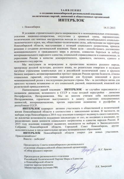 14 ноября 2013 года в Новосибирской области создана региональная предвыборная коалиция патриотических сил ИНТЕРБЛОКВ коалицию вошли: три региональных отделения политических партий (Российская партия Мира и Единства, Партия Социальных Реформ, Интернациональная партия России), три отделения общероссийских общественных организаций ("Собор русского народа", движение "Трудовая Россия", Союз советских офицеров), две региональные общественные организации (женское движение «Доброта», Союз либерал-демократов Новосибирска и Новосибирской области). Коалиция открыта для новых участников, национально-патриотических, демократических и лево-патриотических сил, разделяющих ценности социального патриотизма и единства народов России. Приводим полностью текст Заявления участников новосибирской региональной коалиции ИНТЕРБЛОК для общественности от 14.11.2013: В условиях стремительного роста напряженности в межнациональных отношениях, усиления национал-сепаратизма, отсутствия у правящей элиты, парламентских политических сил внятных инструментов выхода из тупика неолиберального социально-экономического курса, мы, общественно-политические силы, действующие на территории Новосибирской области, выступающие с позиций социального патриотизма, приняли решение о создании региональной коалиции. Наши цели - способствовать достижению межнационального и гражданского мира в регионе, совместно бороться за победу интернационального народного единства, социальной справедливости и взаимопомощи, за укрепление России в качестве демократического, правового, светского, единого и неделимого государства. Председатель Совета новосибирского регионального отделения общероссийской общественной организации «Собор русского народа» К.С. Брагин Председатель регионального отделения Российской Политической Партии Мира и Единства в Новосибирской области (партия зарегистрирована Министерством юстиции РФ) Л.К. Заверский ИО председателя новосибирского регионального отделения общероссийского общественного движения «Трудовая Россия» Е.Ю. Бабульчак Председатель новосибирского регионального общественного женского движения «Доброта» Н.И. Русяева Координатор новосибирского регионального отделения политической партии «Партия социальных реформ» (партия зарегистрирована Министерством юстиции РФ) А.А. Рыжков Председатель Совета новосибирского регионального отделения политической партии «Интернациональная партия России» (оргкомитет партии зарегистрирован Министерством юстиции РФ) Э.М. Симонова Руководитель регионального отделения Союза советских офицеров в Новосибирской области В.Н. Ташкаев Координатор новосибирского регионального общественного движения «Союз либерал-демократов Новосибирска и Новосибирской области» А.А. Петров -- Официальный сайт общероссийской общественной организации " Собор русского народа" http://srn.su/