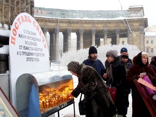 В Санкт-Петербурге прошло молитвенное стояние «Православные против абортов»Трехчасовое молитвенное стояние «Православные против абортов» прошло у Казанского кафедрального собора в Санкт-Петербурге 10 января. Акция состоялась по инициативе Центра социальных программ при участии петербургского отделения медико-просветительского центра «Жизнь». Богослужение возглавил иерей Василий Степичев, клирик церкви святого великомученика Георгия Победоносца при Георгиевской больнице, сообщает сайт «Вода живая». Несмотря на морозный день, многие прохожие подходили к участникам стояния и, ознакомившись с содержанием сопроводительных стендов, ставили свечи. Некоторые задерживались, чтобы помолиться. По данным Центра социальных программ, в России ежедневно погибает от абортов 4 тыс младенцев. На этом фоне меркнет даже вопиющее преступление царя Ирода: российские женщины по собственной воле каждые четыре дня убивают больше детей, чем убил жестокий правитель. Молитвенное стояние — это попытка духовной помощи тем, кто раздумывает, сохранить ли жизнь нерожденному ребенку. Главным практическим делом центра «Жизнь» является работа с беременными в женских консультациях. Волонтеры общаются с женщинами, уже получившими направление на аборт. «Во многих странах, прежде чем пойти на аборт, женщина обязана получить полную информацию о течении операции и ее последствиях. Мы же сталкиваемся с тем, что многие не имеют достаточных знаний по этому вопросу. Мы даем их, и в результате семь из десяти беременных отказываются от убийства», — рассказала руководитель центра Валентина Ятманова. В арсенале работников противоабортного движения — агитационные фильмы, брошюры и экспозиция передвижной выставки «Вред аборта для души и здоровья».