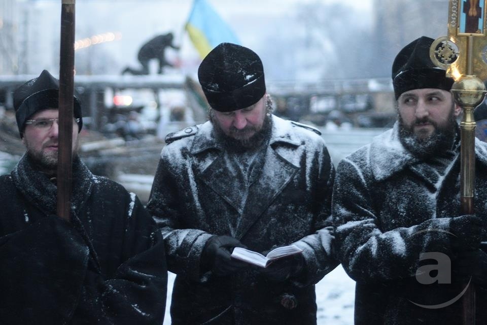 Только что приехал домой переодеться и отогреться. Залез в ванную и отсюда пишу по-быстрому. По-быстрому потому, что к 12 ночи надо вернуться на майдан, который переместился всей своей агрессивной частью на ул. Грушевского. С 14 часов стоял с братией Десятинного монастыря на молебном посту. После 18 часов приехали отец Виктор — секретарь епархии и отец Георгий- пресс-секретарь. Они подменили меня. За что благодарен, потому что от холода мышцы на шее свело. Вы даже не представляете как это важно там стоять священству! Сколько людей подходило (и в масках тоже! тайком) и благодарили, что мы стоим там. Удивлялись, что Московского Патриархата. Пишу быстро: еще зуб на зуб не попадает. И надо собираться обратно. Со стороны майдановцев сплошь агрессия, все время вызовы, оскорбления в сторону ребят- воинов. Об этом напишу после. Ну, если вернусь живым и невредимым! Сейчас прошу молитв!