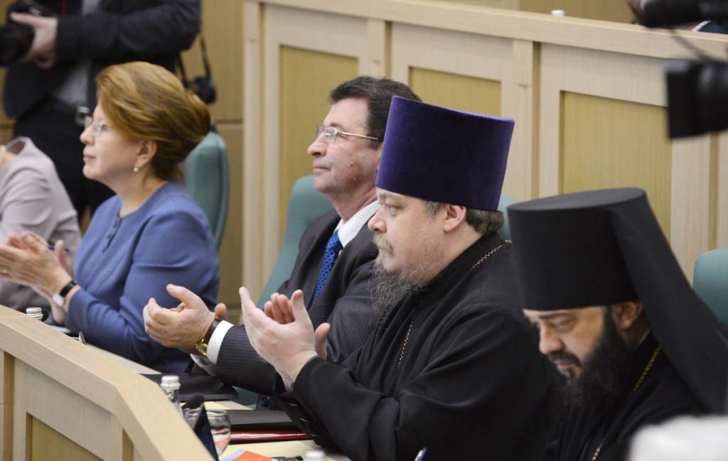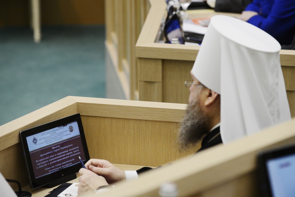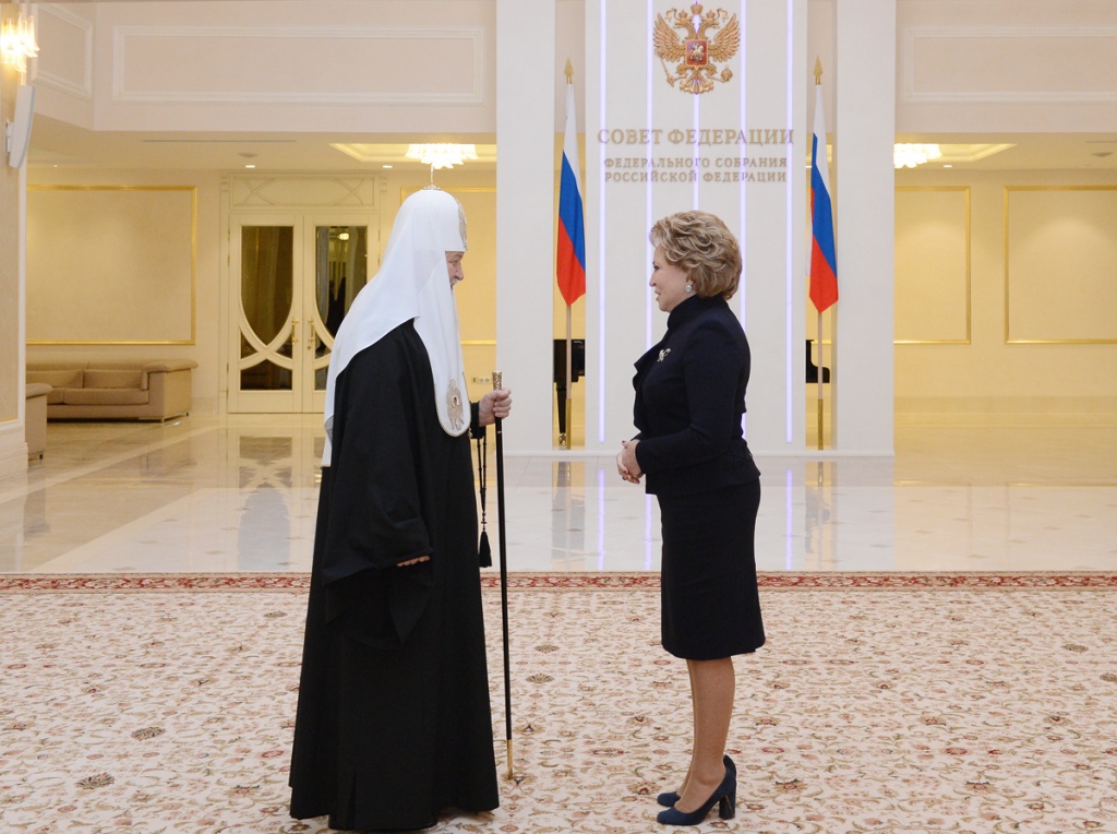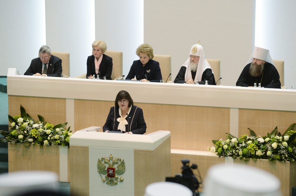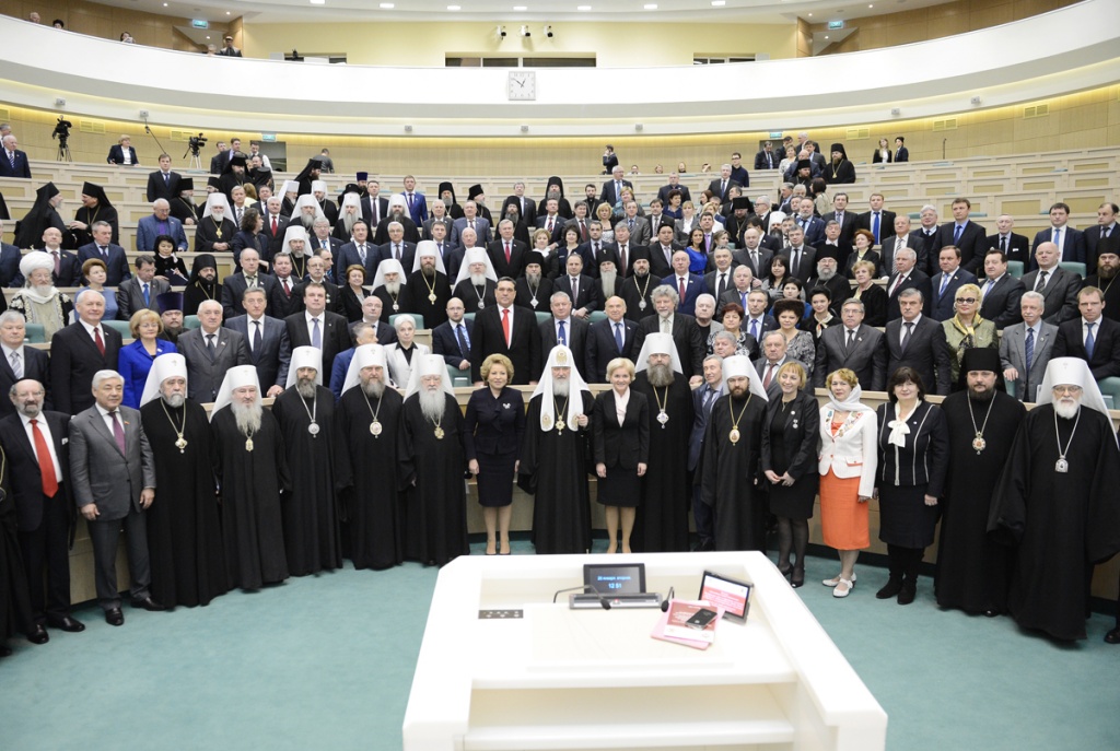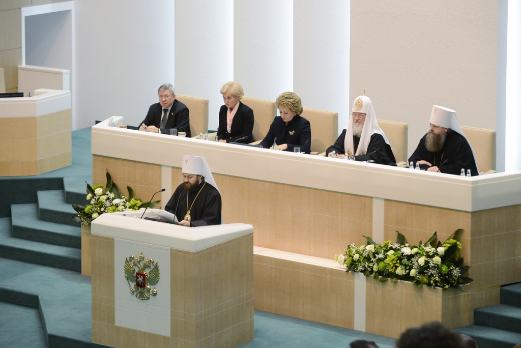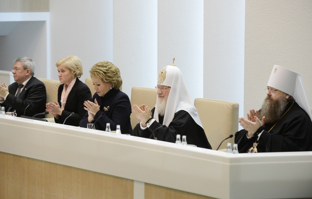 Святейшей Патриарх Кирилл: Сегодня само понятие семьи испытывается на прочность28 января 2014 года Святейший Патриарх Московский и всея Руси Кирилл принял участие в Рождественских парламентских встречах, которые прошли в рамках XXII Международных Рождественских образовательных чтений в Совете Федерации Федерального Собрания Российской Федерации. Уважаемая Валентина Ивановна! Уважаемые члены нашего высокого собрания! Я хотел бы сердечно всех вас приветствовать и выразить особенную благодарность Валентине Ивановне, руководителям комитетов, аппарату Совета Федерации в связи с возможностью провести здесь слушания в рамках Рождественских чтений. Отрадно, что сегодня здесь присутствуют не только сенаторы, но и депутаты Государственной Думы, главы митрополий, епархиальные архиереи, руководители и представители региональных законодательных собраний. Надеюсь, что проведение подобных встреч станет доброй традицией, и я благодарю Вас, Валентина Ивановна, за предложение, которое Вы сейчас сделали. Полагаю, что площадка Совета Федерации и Государственной Думы — это очень важное место реального диалога между Церковью и светской властью. В парламентах осуществляется интеллектуальный процесс, разрабатываются законы, а значит, формируется теория стратегического развития страны. И как важно и для Церкви, и для других традиционных религий России иметь реальный живой диалог с теми людьми, кто вовлечен с полной ответственностью в этот процесс. Мы собрались в год 700-летия преподобного Сергия, и мы знаем, какое огромное значение этот святой имеет для нашего народа, для становления нашего государства, нашего национального самосознания. Но я хотел бы сейчас сказать о чем-то другом. Преподобный Сергий и его святые родители, Кирилл и Мария, являлись и являются до сих пор особым примером подлинной христианской семьи, члены которой связаны крепкими духовными узами, а родители осознают свою ответственность за детей на протяжении всей жизни. Преподобный, в котором с детства воспитывали любовь к Родине, неслучайно стал Игуменом Русской земли и общенациональным духовным лидером. Патриотизмом, готовностью людей жертвенно служить на благо Отечества всегда славилась наша страна. Благодаря таким своим сыновьям, как преподобный Сергий, она обретала независимость, крепла; благодаря таким людям развивалось наше духовное, культурное и национальное самосознание. Русская Православная Церковь, свидетельствуя о непреходящих евангельских идеалах и ценностях, всегда призывала и будет призывать людей руководствоваться этими ценностями в своей семейной, общественной и профессиональной жизни и деятельности. Учение Христово в течение веков глубоко укоренялось в русской душе. Неслучайно религиозный мыслитель и философ Николай Онуфриевич Лосский указывал: «Русская идея — христианская идея». В связи с этим нельзя не сказать о значимости взаимодействия Церкви и законодательной власти — как в центре, так и в регионах. Я хотел бы высказать свою точку зрения на то, какое значение имеет сейчас Совет Федерации. Мы видим, как возрастает авторитет верхней палаты российского парламента. Совет Федерации становится местом реального диалога между регионами, местом, где представители регионов могут озвучивать свои проблемы и продвигать свои законодательные 
