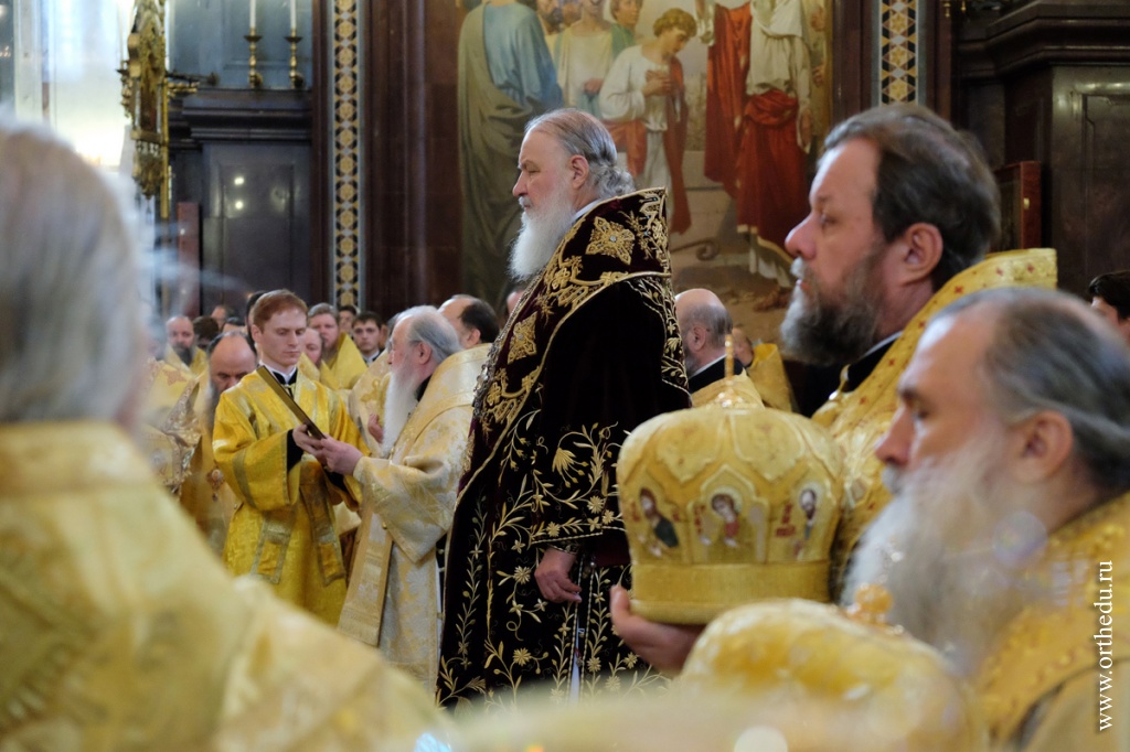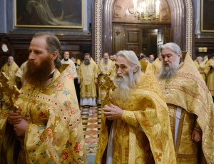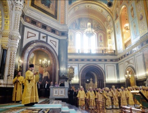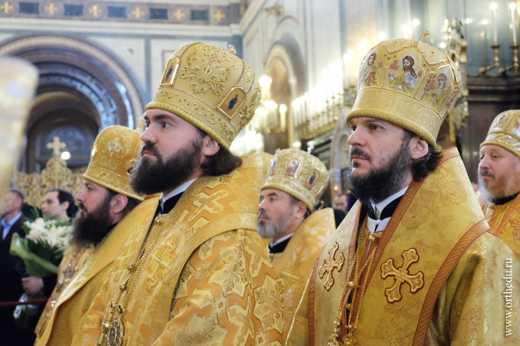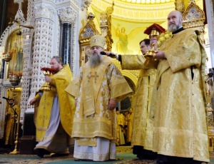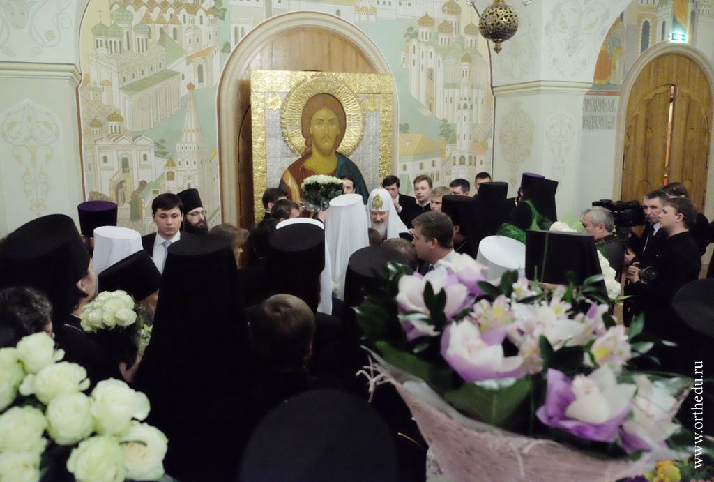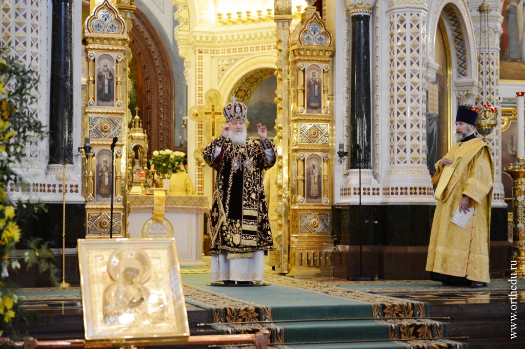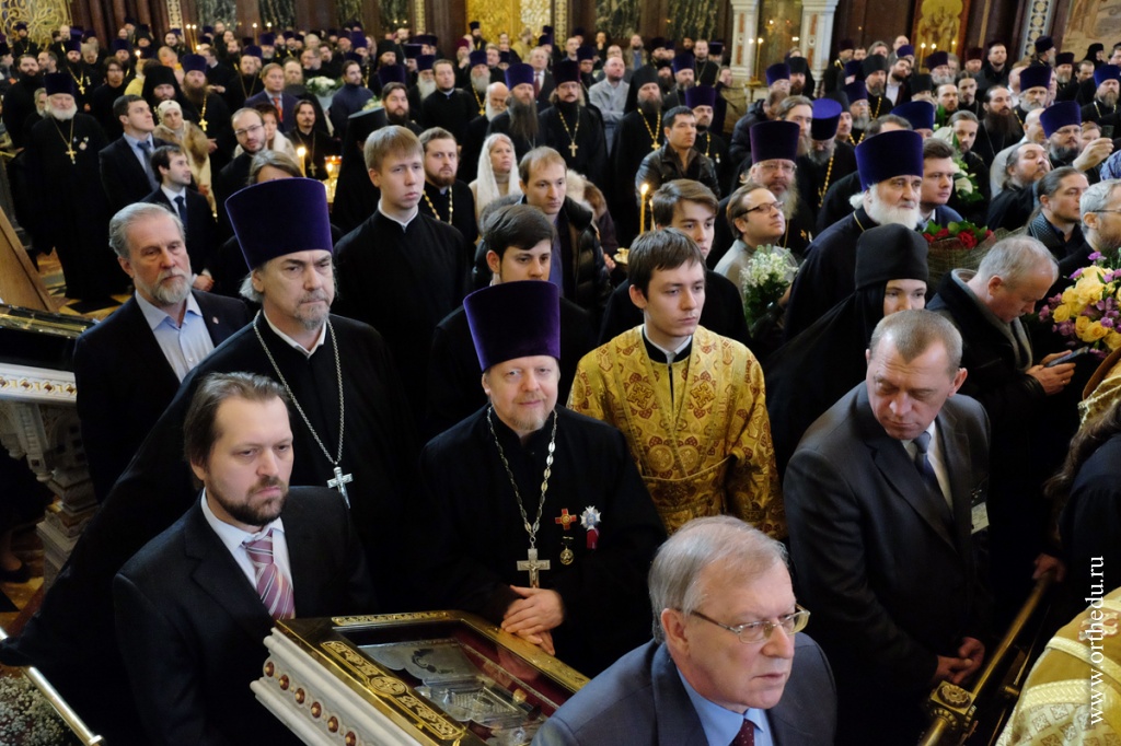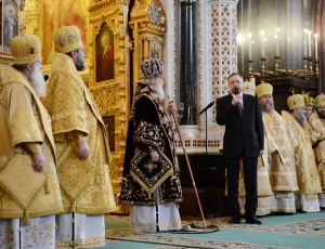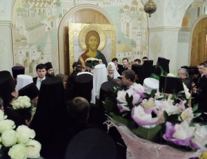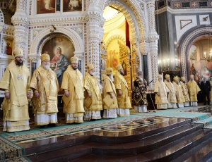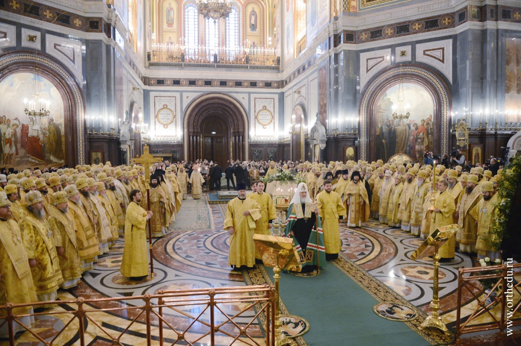 Пятая годовщина интронизации Святейшего Патриарха Кирилла1 февраля 2014 года, в пятую годовщину интронизации Святейшего Патриарха Московского и всея Руси Кирилла, в кафедральном соборном Храме Христа Спасителя в Москве была совершена Божественная литургия. В богослужении принимал участие правящие архиереи Новосибирской митрополии. Предстоятелю Русской Православной Церкви сослужили: митрополит Крутицкий и Коломенский Ювеналий; митрополит Кишиневский и всея Молдовы Владимир; митрополит Астанайский и Казахстанский Александр; митрополит Ташкентский и Узбекистанский Викентий; митрополит Саранский и Мордовский Варсонофий, управляющий делами Московской Патриархии; митрополит Минский и Слуцкий Павел, Патриарший экзарх всея Беларуси; митрополит Волоколамский Иларион, председатель Отдела внешних церковных связей Московского Патриархата; митрополит Восточно-Американский и Нью-Йоркский Иларион, первоиерарх Русской Зарубежной Церкви; митрополит Бориспольский и Броварской Антоний, управляющий делами Украинской Православной Церкви; сонм иерархов Русской Православной Церкви. Также Его Святейшеству сослужили представители Поместных Православных Церквей при Патриархе Московском и всея Руси:митрополит Киринский Афанасий (Александрийская Православная Церковь), архиепископ Филиппопольский Нифон(Антиохийская Православная Церковь), епископ Моравичский Антоний (Сербская Православная Церковь), архимандрит Стефан (Диспиракис) (Иерусалимская Православная Церковь), архимандрит Феоктист (Димитров) (Болгарская Православная Церковь). Среди сослуживших Святейшему Патриарху Кириллу также были: схиархимандрит Илий (Ноздрин); протоиерей Владимир Диваков, секретарь Патриарха Московского и всея Руси по г. Москве; протоиерей Всеволод Чаплин, председатель Синодального отдела по взаимоотношениям Церкви и общества; архимандрит Тихон (Шевкунов), ответственный секретарь Патриаршего совета по культуре; протоиерей Димитрий Смирнов, председатель Патриаршей комиссии по вопросам семьи, защиты материнства и детства; протоиерей Михаил Рязанцев, ключарь Храма Христа Спасителя; протоиерей Александр Ганаба, секретарь Московской областной епархии; протоиерей Сергий Привалов, и.о. председателя Синодального отдела по взаимодействию с Вооруженными силами и правоохранительными органами; протоиерей Николай Балашов, заместитель председателя Отдела внешних церковных связей; архимандрит Филарет (Булеков), заместитель председателя Отдела внешних церковных связей; протоиерей Александр Агейкин, настоятель Богоявленского кафедрального собора г. Москвы; наместники ставропигиальных монастырей, духовенство г. Москвы. На богослужении присутствовали полномочный представитель Президента РФ в Центральном федеральном округе А.Д. Беглов, генеральный директор Государственной корпорации по атомной энергии «Росатом» С.В. Кириенко, председательСинодального информационного отдела В.Р. Легойда, руководитель Художественно-производственного предприятия«Софрино» Е.А. Пархаев, помощник председателя Правительства Российской Федерации Г.Г. Онищенко, настоятельницы женских обителей, священнослужители Москвы и Подмосковья, сотрудники синодальных и иных церковных структур, представители приходских советов, преподаватели и учащиеся церковных учебных з