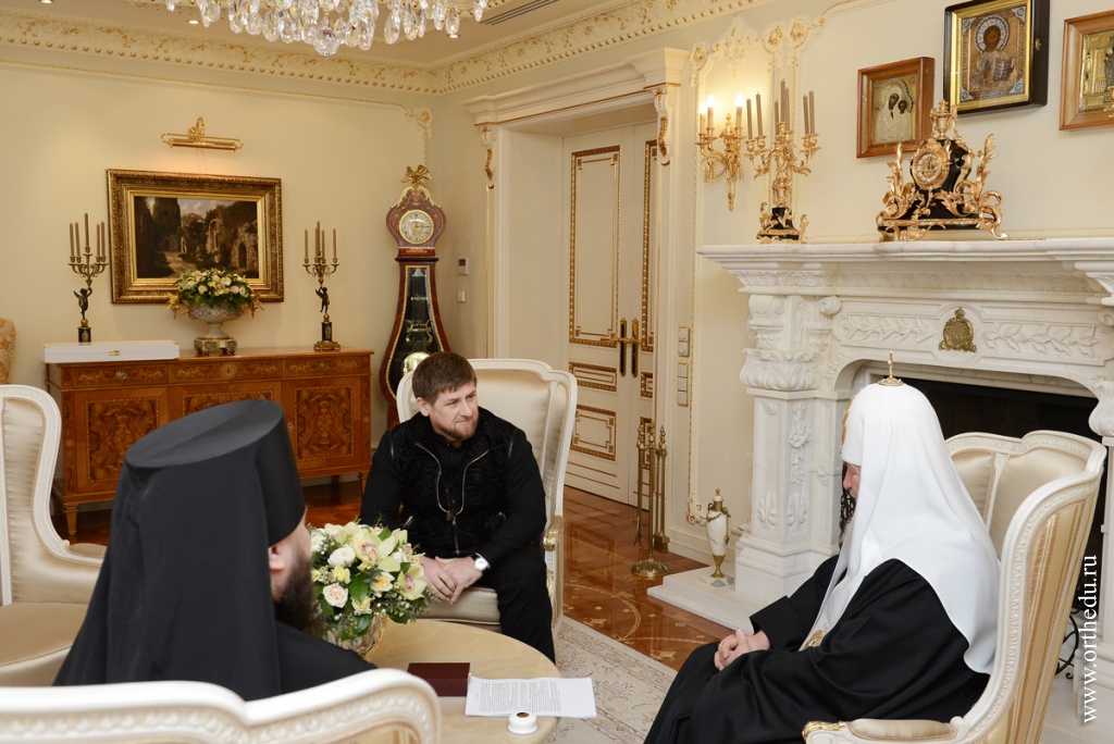 Состоялась встреча Святейшего Патриарха Кирилла с главой Чеченской Республики Р.А. Кадыровым21 февраля 2014 года в Патриаршей и Синодальной резиденции в Даниловом монастыре в Москве состоялась встреча Святейшего Патриарха Московского и всея Руси Кирилла с главой Чеченской Республики Р.А. Кадыровым. В беседе принял участие епископ Махачкалинский и Грозненский Варлаам. Обращаясь к главе республики, Святейший Патриарх Кирилл, в частности, сказал: «Я бы хотел сердечно Вас приветствовать и сказать, что с Вашим именем, с именем Вашего покойного родителя, которого я знал и очень уважал, связаны очень большие, исторические перемены. Мы имеем возможность видеть, что сейчас происходит в Чечне. Мы видим, как отстроен Грозный, как восстановлена жизнь Чеченской Республики, как резко сократилось количество террористических актов. Мы знакомы с Вашей решительной позицией в отношении терроризма, которая находит отклик и в наших сердцах. В том, что Чеченская Республика, пройдя через тяжелейшие испытания, становится сегодня процветающим краем, заслуга и Вашего родителя, и Ваша заслуга, и мы это очень ценим.
