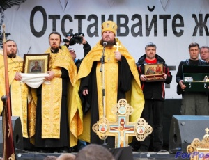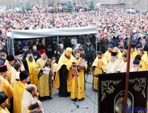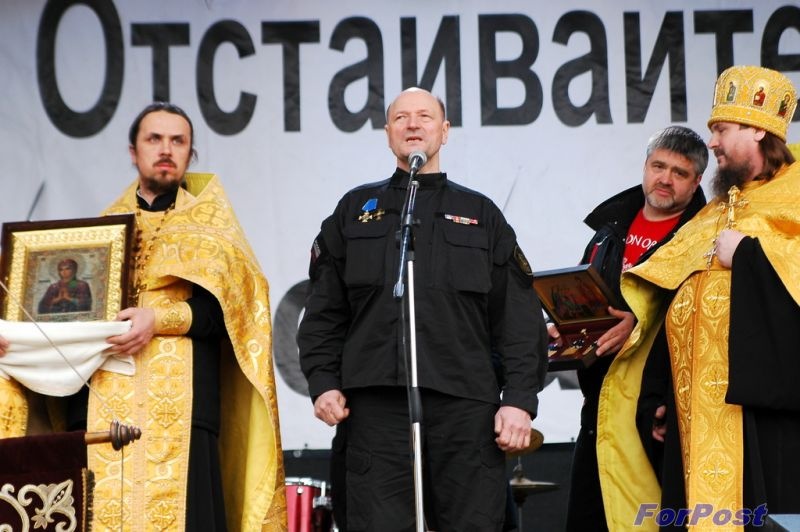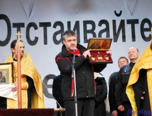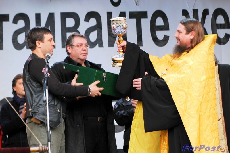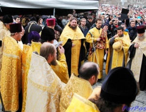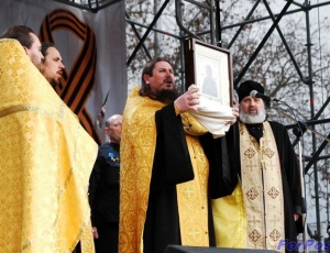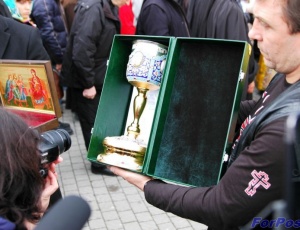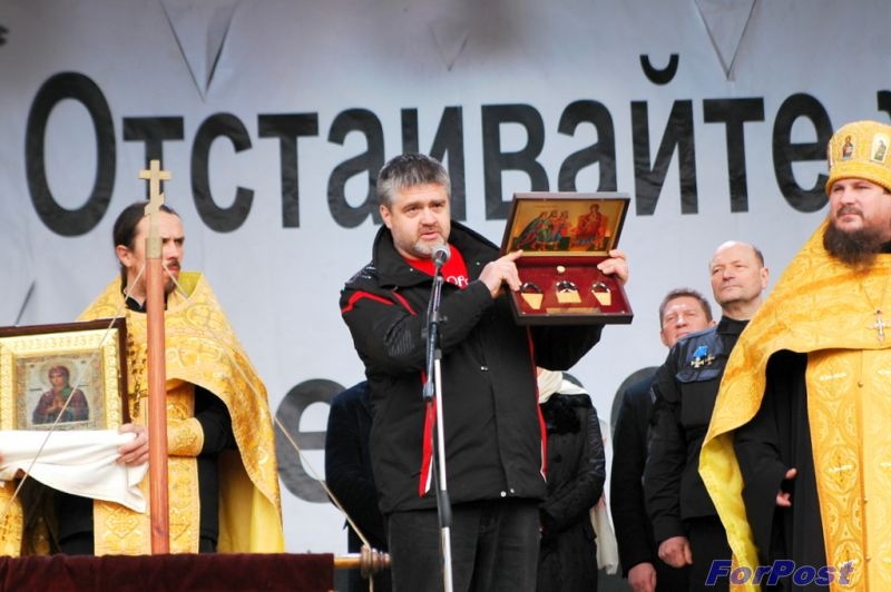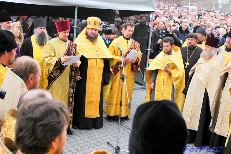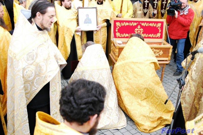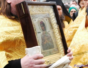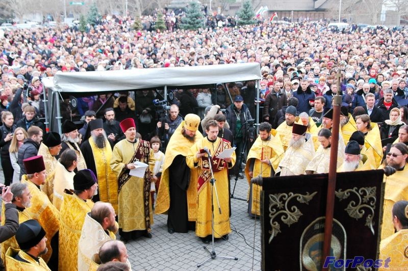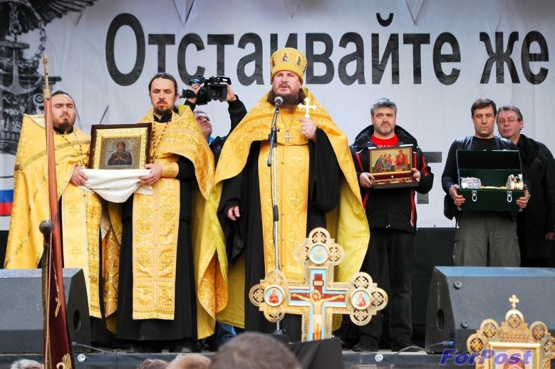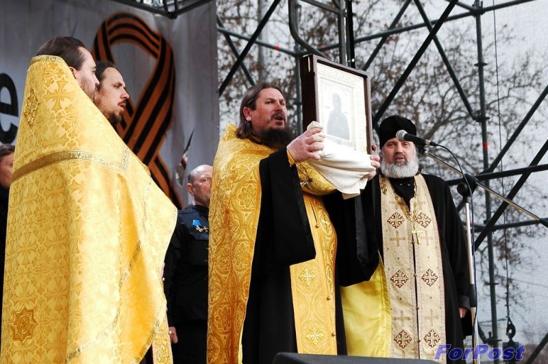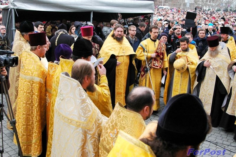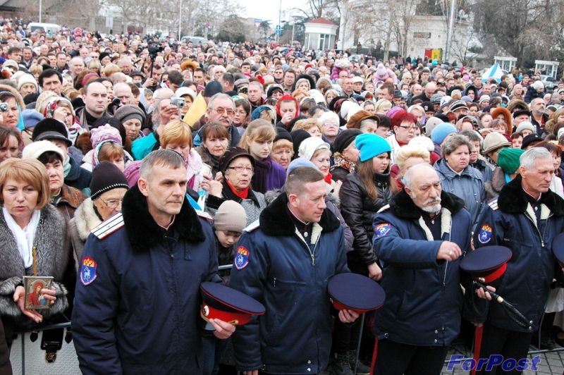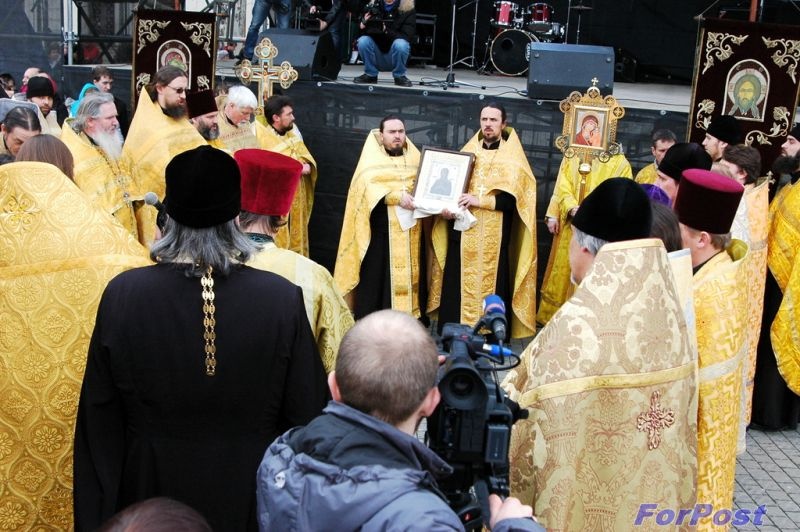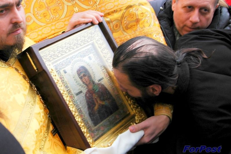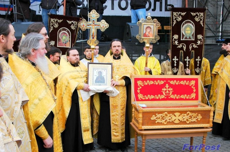 По словам одного из организаторов прибытия чудотворного образа Богородицы в город Севастополь ― бывшего боевого офицера антитеррористического спецподразделения «Альфа» Сергея Полякова, эта икона уже не первый раз подает знак, и это происходит в самые сложные минуты жизни государства. «Это было и перед гибелью подводной лодки «Курск», и перед взрывами домов в Москве, перед Норд-Остом, перед Бесланом, и пять лет назад, когда икона здесь пребывала, она тоже подала знак, но тогда мы не знали, к чему он был дан», ― рассказал боевой офицер. Напомним, что впервые эта икона замироточила именно в Севастополе. Этот факт, произошедший летом 2009 года, засвидетельствовали многие, в том числе личный состав Бригады морской пехоты. В тот день военные моряки наблюдали истечение мира красного цвета. «Когда икона посещала полк морской пехоты российской армии, она не просто замироточила, а необычно закровоточила. И нарушая все законы физики, миро пошло не вниз, а вверх, и два матроса, которые её держали, увидели, что все перчатки их были в крови», ― рассказал историю тех событий Сергей Поляков. Мироточение икон часто происходит, когда в стране не всё в порядке, когда сердца людей ожесточаются и отступают от Бога. «Матерь Божья подала знак, что что-то здесь не всё благополучно, и нас ждут испытания», — рассказал Сергей Поляков. Также, на время молебна на площадь Нахимова из Свято-Климентовского Инкерманского мужского монастыря была доставлена рака с мощами святого священномученика Климента Римского. Лица многих священников во время службы несли в себе явную тревогу, не каждый день в их руках оказывается такое живое проявление Божественной силы. Стоит отметить и тот факт, что ещё никогда молебен на главной площади города не собирал такое количество народа. Севастополь, поднявшийся против фашистской власти, взявшей верх в стране, как один встал в этот день на молитву, возносимую к Небесам. «Любовь — вот то, что нас собрало сегодня здесь, на этой площади, любовь к Богу, любовь к Его Пречистой Матери и всем святым, любовь к нашему родному городу, любовь к нашей стране, к нашим ближним — вот то, что побудило всех нас прийти сюда и вознести общую соборную молитву, — обратился к собравшимся благочинный Севастополя протоиерей Сергий Халюта и напомнил всем заповедь Христа — Где двое или трое собраны во имя Мое, там Я посреди них». Также благочинный рассказал собравшимся на площади, что именно в этот день православная церковь отмечает прощеное воскресение, и призвал людей обрести в своих сердцах любовь к Богу и прощение к врагам и близким. «Мир — вот то самое ценное, что нужно человеку. Мир в сердце, мир в семье, мир в граде, мир в стране и мир на земле. И сегодня мы и просили Милосердную Матерь Божию, чтобы Она даровала нам в наших сердцах мир и любовь», ― обратился к народу отец Сергий. После молебна в дар Севастополю были переданы точная копия Даров волхвов, привезенная в Севастополь президентом фонда «Возрождение православных святынь Руси» из Москвы Сергеем Шалимовым и потир (чаша для причастия) от Благотворительного фонда «Православный Крым», Союза Донских казаков и его атамана Анатолия Афромеева. В момент, когда икона покидала площадь, священникам пришлось идти сквозь плотную толпу людей, пожелавших приложиться к Чудотворному образу. Те, кто успел это сде