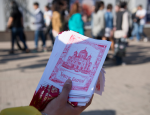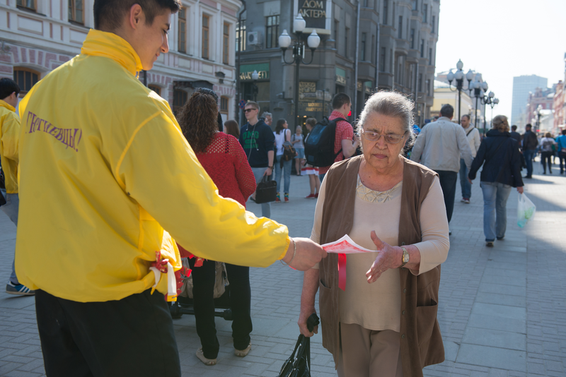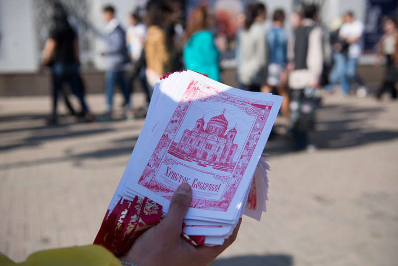 Пасха на Старом Арбате20 апреля 2014 года, в Праздник Пасхи, объединение православных молодежных организаций «Георгиевцы!» провели в Москве на Старом Арбате необычную пасхальную акцию: за час было роздано 2500 листовок с информацией о празднике Воскресения Христова и красных пасхальных ленточек. Наш репортаж о том, как это было. Воскресенье, три часа дня. На Старом Арбате солнечно и оживленно: толпится шумная группа итальянских экскурсантов, неспешно идут две нарядные дамы в темно-бордовом бархатном и твидовом черном пиджаках, пробегают школьники в ярких футболках… На пестром фоне массы разнообразных прохожих выделяется десяток молодых людей с привязанными сзади к поясам джинсов сковородками, которые волочатся следом за ними по земле, как привязанные на нитку бумажные «мышки» для кошек: в погоне за покупателями магазины и фирмы стараются быть оригинальными и запоминающимися. - Христос воскресе! - на минутку разноголосый арбатский шум перекрывает пасхальный возглас председателя движения «Георгиевцы» Вадима Квятковского. Так и ожидаешь в ответ услышать раскатистое «Воистину воскресе!», но на приветствие Светлого Праздника Христова Воскресения Арбат отвечает тишиной. Толпа на московских улицах, как кажется, равнодушна к пасхальному призыву, не знает, как на него ответить или попросту не привыкла отвечать... С этой точки начинается необычная пасхальная акция: добровольцы из движения «Георгиевцы!» входят на Старый Арбат, чтобы раздать прохожим 2500 листовок с информацией о главном христианском Празднике - Пасхе - и декоративные алые ленточки. - Акция по распространению просветительских листовок проходит в Москве уже несколько лет, - поясняет председатель движения «Георгиевцы» Вадим Квятковский. – Их начали распространять прихожане храма Тихвинской иконы Божией Матери в Алексеевском, а потом передали это дело Объединению православных молодежных организаций «Георгиевцы!» и Синодальному отделу по делам молодежи. Обычно листовки раздаются на приходах в Великую Субботу, когда в канун Пасхи люди приходят в храмы, чтобы освятить куличи и яйца. Цель - помочь людям понять смысл Праздника Пасхи, узнать для себя что-то новое и полезное. В прошлом году было напечатано около миллиона листовок, которые распространили примерно в полусотне епархий Русской православной Церкви. В этом году акцию решили расширить и раздать листовки не только в канун, но и в сам Праздник Пасхи, и выбрали для распространения одну из самых оживленных пешеходных улиц Москвы – Старый Арбат. Шесть волонтеров в фирменных куртках и девушка в нарядном жакете вливаются в толпу и стараются вручить листочки встречным прохожим. - Христос Воскресе! С Праздником Вас! Вот, возьмите, почитайте о празднике… Ради эксперимента беру несколько листовок, чтобы раздать. На мне красная кофточка и такого же цвета лента на голове, наряд вполне пасхальный и подходящий для раздачи праздничных листовок. Идем по Арбату ритмичным прогулочным шагом и успеваем то и дело вручать листочки встречным прохожим. Многие берут чисто машинально: дают – надо взять. Кто-то отворачивается или категорически отказывается брать. Самое неприятное – когда обращаешься к человеку, а он проходит мимо, словно тебя совсем нет. Чтобы было не так неловко, стараюсь идти рядом с волонтером Аней: по пути с ней мож