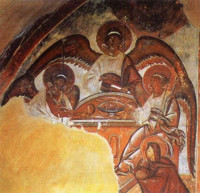 Постепенно фигуры Авраама и Сары, сохраняя свое место на первом плане композиции, уменьшаются в размерах. На фреске Феофана Грека из Спасо-Преображенского храма на Ильине улице в Новгороде (1378 г.) фигура Сары, почтительно склонившейся к ногам сидящего справа ангела (фигура Авраама не сохранилась), кажется маленькой, хотя на самом деле это и не так. На иконе XIV века «Зырянская Троица» (приписываемой св. Стефану Пермскому) Авраам в два раза уменьшен в росте по сравнению с ангелами, а Сара скромно расположилась на дальнем плане. И даже яркие красные одежды не приближают ее к зрителю. Говоря о фреске Феофана Грека, необходимо заметить, что в ней впервые фигуры ангелов образуют пирамидальную композицию, вписанную в круг, очерченный контурами их огромных крыльев. Цветовое решение - белые одежды и светлый фон, темные лики, руки и нимбы – передает одно из важнейших мистических ощущений исихазма: восприятие Божественного света как «пресветлого мрака». Лики ангелов переполнены нетварным светом горнего мира, который является несовершенному зрению человека как тьма. Такое восприятие света характеризует высшую стадию молитвенной практики исихазма, когда свет уже глубоко преобразил душу человека.