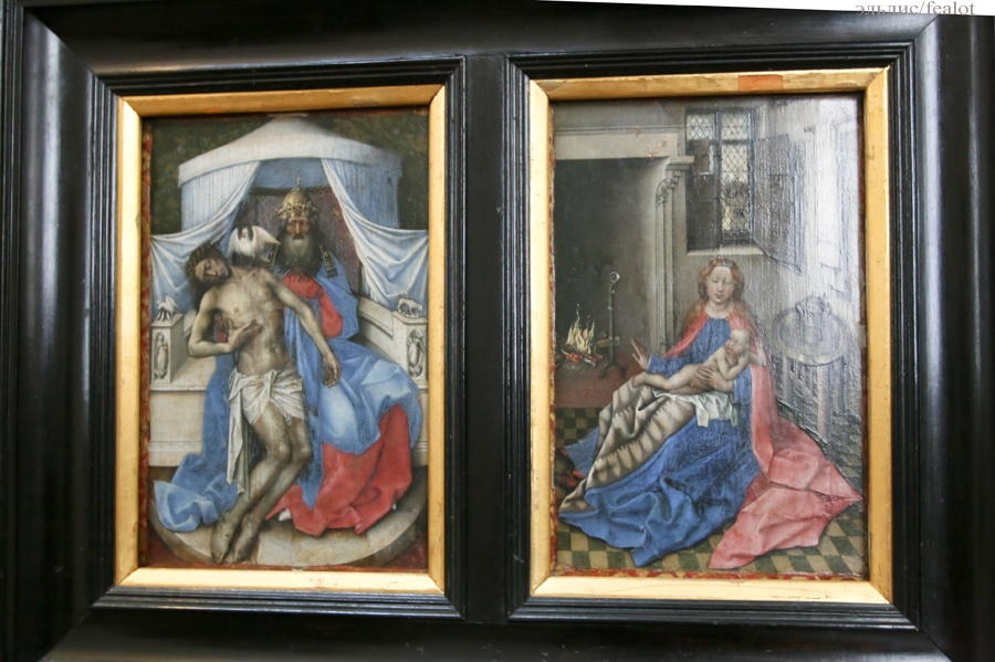 Другой вариант иконографии Троицы можно увидеть в диптихе Робера Кампена, нидерландского современника Мазаччо, из Эрмитажа. На одной створке изображена Богоматерь с Младенцем, на другой – Троица. Бог Отец восседает на престоле, поддерживая мертвое тело Сына. Между головами Отца и Сына изображен Святой Дух в виде голубя. На сей раз отцовское страдание становится и духовным, и эмоциональным стержнем иконографии, а мотив отношений Отца и Сына в контексте всего диптиха открыто сопоставляется с материнским диалогом Марии с Младенцем Иисусом. Возможно, такая версия образа Троицы возникла не без влияния иконографии Pietà (итал. «милосердие»), в которой Мария оплакивает смерть Иисуса, держа Его безжизненное тело на коленях подобно тому, как носила Его на руках, когда Он был Младенцем. Традиция таких изображений возникла в Германии в XIII веке, а в более поздние времена стала знаменитой, благодаря композиции Микеланджело «Римская Pietà» из собора св. Петра в Риме (1498). Pietà принадлежит к особому типу образов зрелого и позднего средневековья, известных под названием unio mistica. Они должны были передавать тонкий мистический опыт соединения души молящегося с Иисусом в любви и сопереживания (compassio) Ему в страданиях. При всей сложности подобных духовных ощущений не последнюю роль в них играли эмоции, человеческие движения сердца, которые в XV веке в Нидерландах захотелось перенести с образа Марии на образ Небесного Отца, Чья Родительская жертва тоже могла стать предметом острого душевного переживания. Однако наряду с чисто эмоциональной стороной (которая никогда не отбрасывалась католической духовностью и органично встраивалась в практику созерцательной молитвы) у такой иконографии есть и важный литургический аспект, снова связанный с Евхаристией. Не случайно композиции Pietà часто размещались в алтаре: Мария как олицетворение земной Церкви держала на руках тело Христово по аналогии со священником, совершающим Таинство. Тот же смысл несла в себе и иконография Троицы, представленная в работе нидерландского мастера.