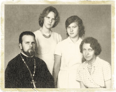 Владыка Корнилий: Ну и что? В 22 я уже дьяконом стал. А с женитьбой получилось так: пришел сюда, в Епархиальное управление, а тут машинистка сидит... Ну и все! Матушка Татьяна была немного старше меня и захватила еще Русское христианское движение, которое было распространено и в Эстонии тоже. Так что и я в какой-то мере к нему приобщился. Вот посмотрите снимок — мы здесь с супругой Татьяной и старшей дочерью Еленой... К сожалению, матушка рано умерла. Мой арест, тюрьма. А на руках — две дочки... Конечно, это подорвало ее и без того слабое здоровье.