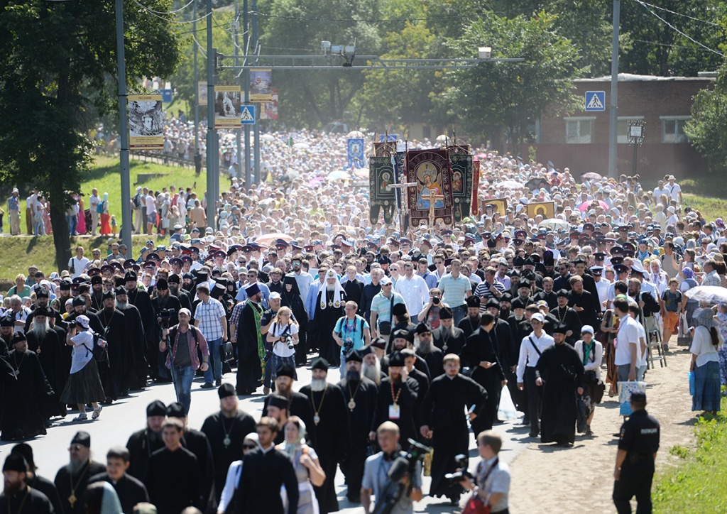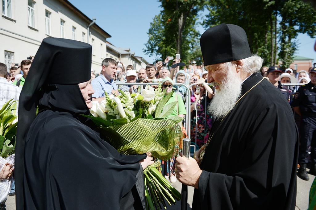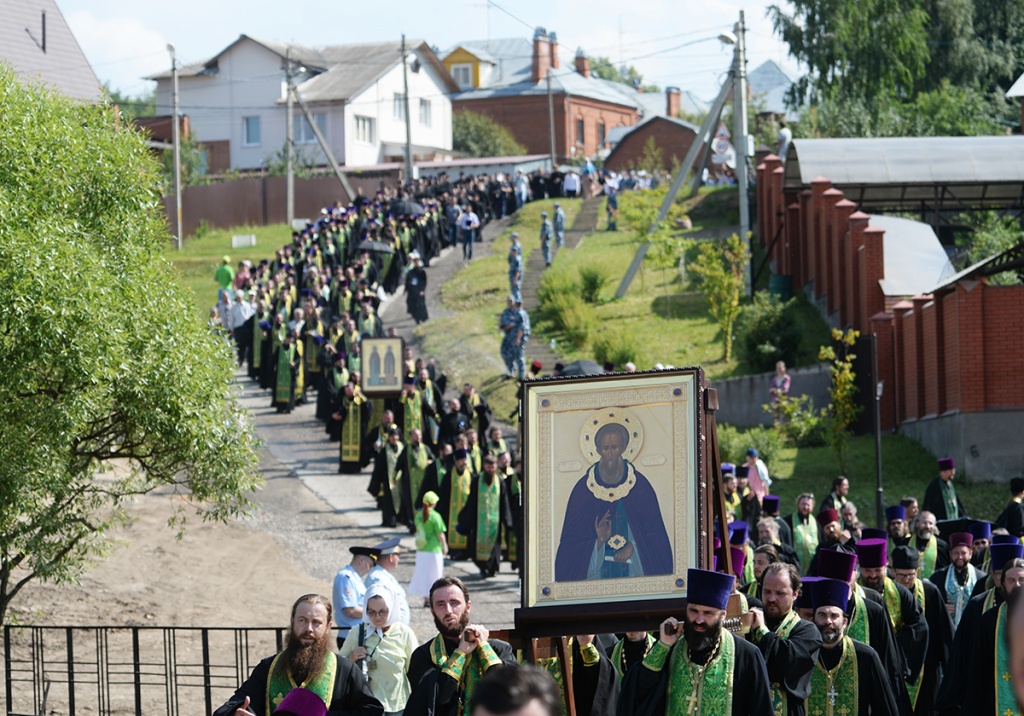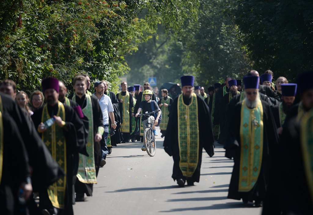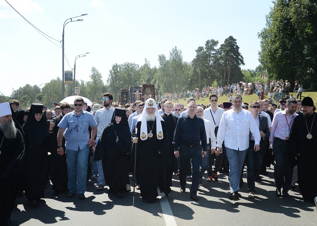 Шествие предварил молебен в Никольском соборе Покровской обители. Богослужение и крестный ход возглавил Святейший Патриарх Московский и всея Руси Кирилл.