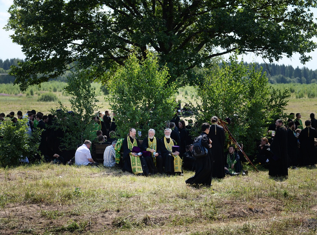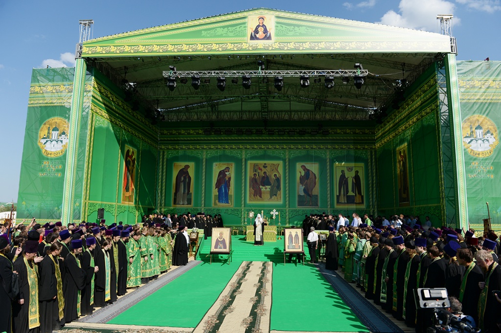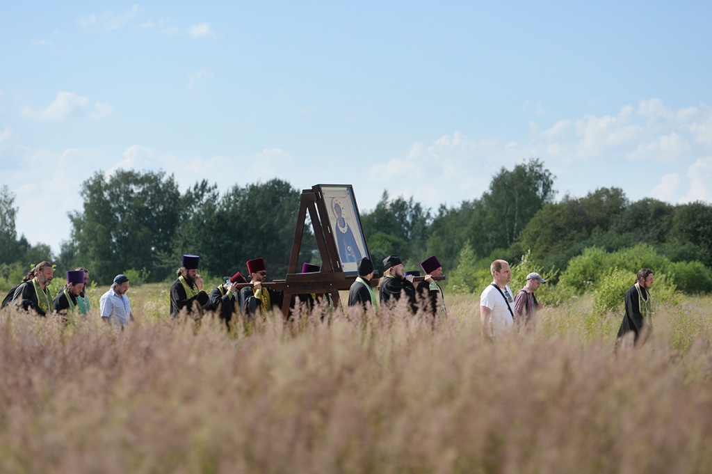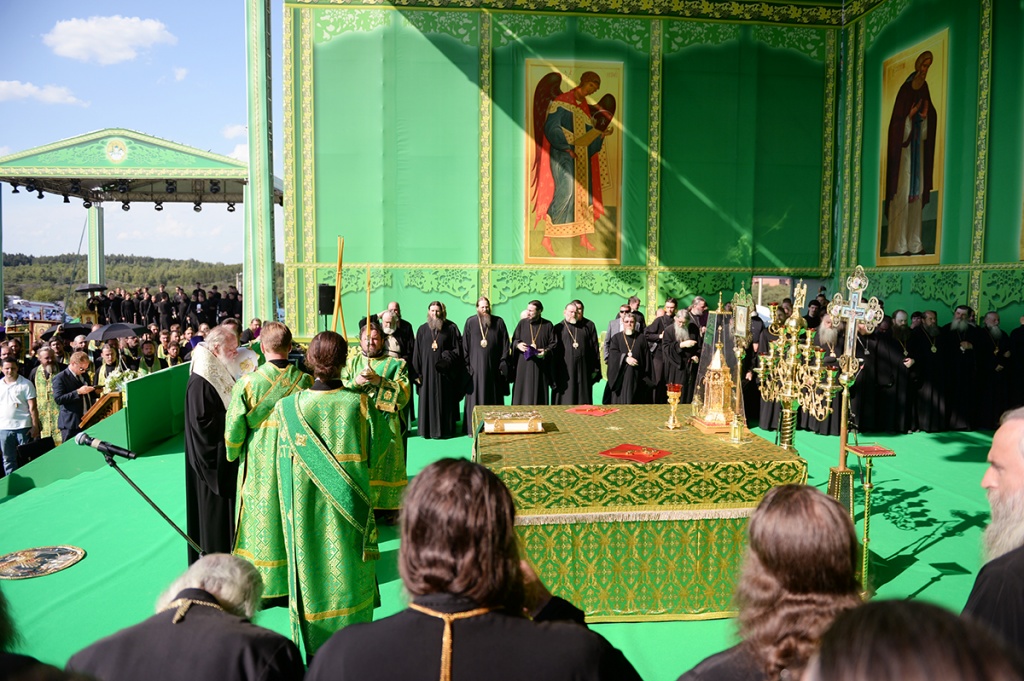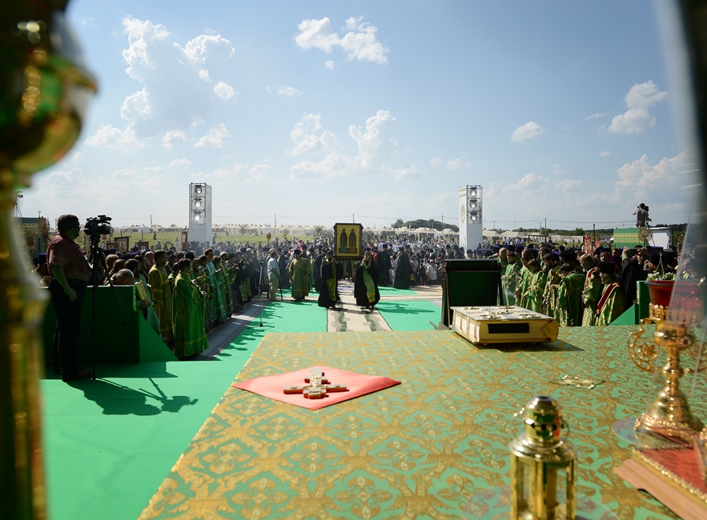 Вблизи палаточного городка, развернутого на Благовещенском поле, организовано место для совершения богослужений. После прибытия сюда керстного хода Предстоятель Русской Церкви совершил молебное пение, была прочитана молитва преподобному Сергию Радонежскому.