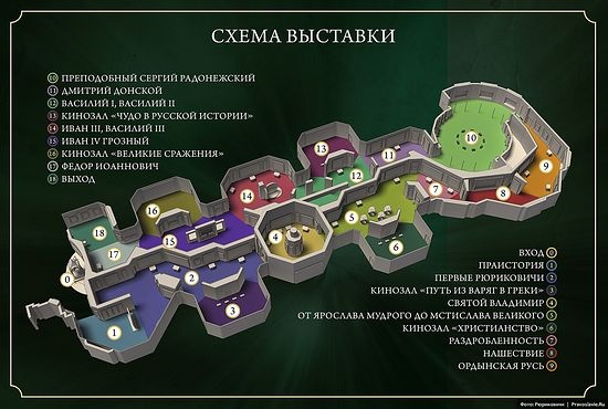 СХЕМА выставки На выставке «Моя история. Рюриковичи» семисотлетняя история Древней Руси представлена в 18 мультимедийных залах общей площадью 4000 квадратных метров. Перед зрителями в буквальном смысле оживают созданные историками, художниками и специалистами в области самых современных компьютерных технологий далекие события «Повести временных лет», истории древних торговых путей и легендарных сражений, тайны укрепленных крепостей и великих побед, малоизвестные факты периода раздробленности и татаро-монгольского нашествия.