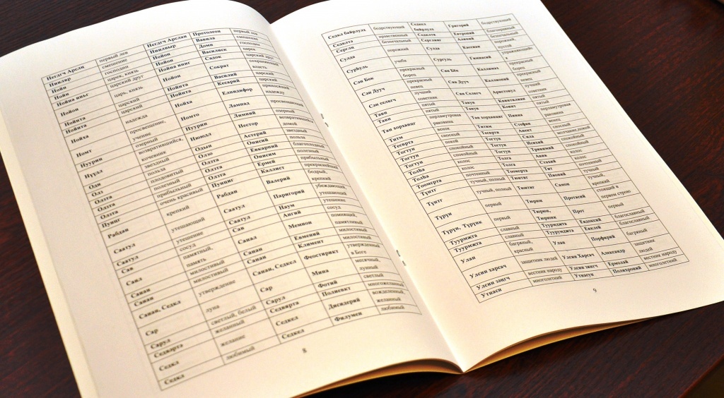 Составителем сборника имен стала Вера Шуграева − поэтесса, внештатный сотрудник Института перевода Библии. Ранее она участвовала в работе над калмыцким переводом Нового Завета, книг Бытия, Руфи, Псалтири, Притч Соломоновых. Ее работа была сродни поэтической, поскольку в отдельных случаях для передачи смысла слова приходилось создавать сложносоставные слова или изобретать новые. Фактически, это была работа, подобная той, которую проделали равноапостольные Кирилл и Мефодий, когда, не имея возможности брать христианские понятия из славянского языка, они создавали новый понятийный аппарат. Редакторами издания стали учителя-калмыковеды Русской национальной гимназии имени преподобного Сергия Радонежского. − Это замечательная идея, − говорит журналист, советник главы правительства Калмыкии Лари Илишкин. – Ведь, на самом деле, в русском языке есть много монгольских слов, и наоборот: в монгольском бытуют слова, пришедшие из русского. Мне кажется, наши народы имеют сильную связь − нравится это кому-то или нет, но это так. И изданная епархией книга поможет нам лучше понимать друг друга. Сборник будет отпечатан тиражом 1000 экземпляров и попадет на приходы и в школьные библиотеки уже к Рождеству.