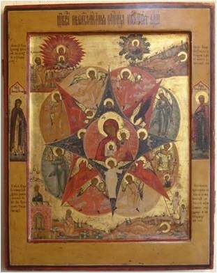 Глаз (в треугольнике или овале) встречался в древне-византийской иконографии (есть образцы VI в.) и являлся символом всеведения Божия. Оттуда он перешел на некоторые иконы в Российские храмы в XVIII столетии. И тоже именовался, как «Всевидящее Око». Всевидящее Око – одно из самых сложных символических иконографических композиций: Господь уподобляется солнцу, как источник света, а способ Божественного ведения — глазу. Появляется в русской иконографии изначально как купольное изображение в храмах: на вершине свода или какой-либо его части. Позднее из купольного изображения переходит в изображение, выполненное на иконописной доске, как икона. Встречается также на иконе «Неопалимая купина».