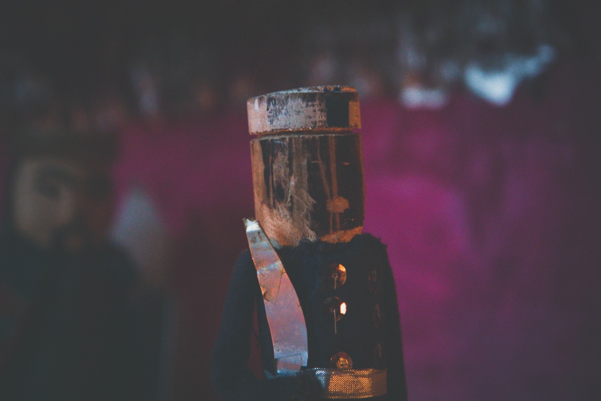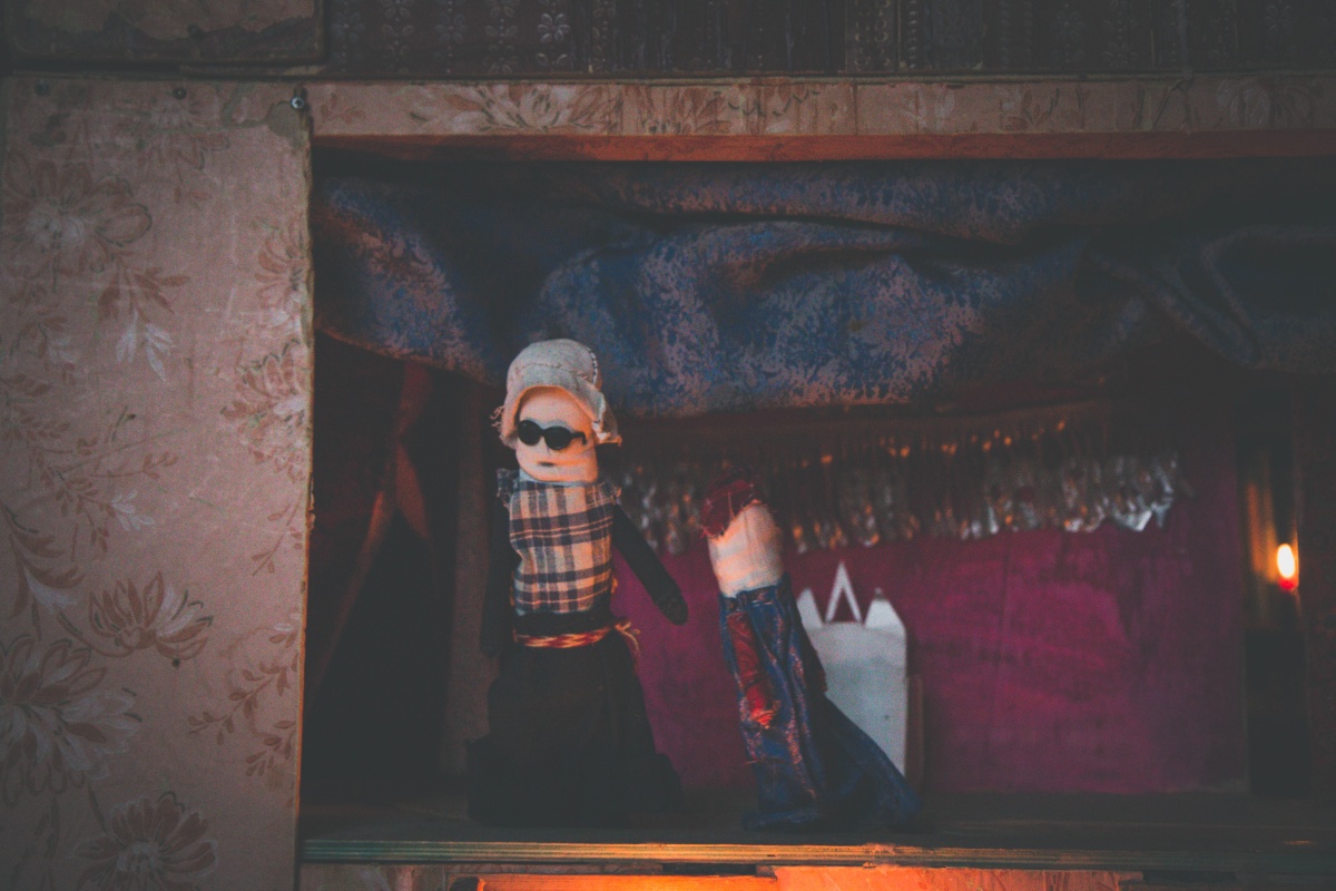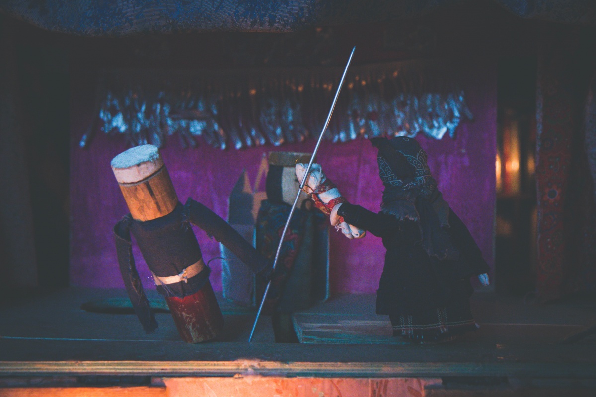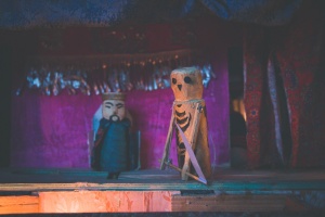 В этом месте у нас было много вопросов: как ходят куклы в стержневом вертепном театре, как произносится текст? Оказывается, текст действия, происходящего в верхнем этаже, произносится без интонации, монотонно.
