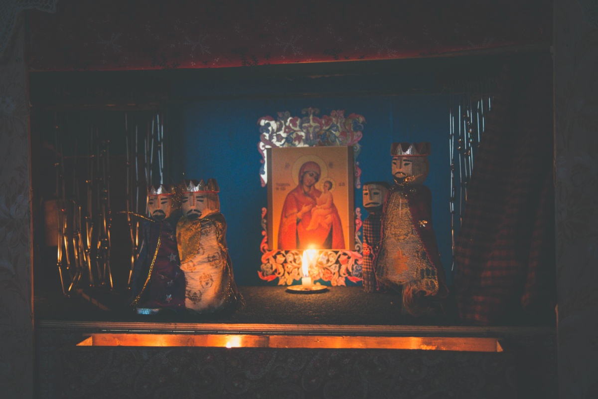 Куклу Младенца или куклу Богоматери, которые есть в западных вертепах, невозможно сделать и ими играть. Вместо Девы Марии была или икона Рождества, или какая-то картинка из календаря, изображающая Рождество. По возможности старались не использовать изображений священных, это у нас так получилось, что икона Богородицы с младенцем. А вообще в театре это было недопустимо.