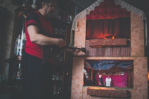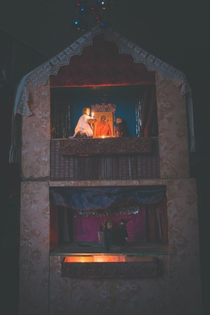 Во-вторых, вертеп – это профессиональное действо. Вертепщик носит на себе вертеп, который был поменьше нашего и был единой конструкцией, с ним ходит его жена и дети, которые помогают ему во время представления. Жена и дети поют во время действия в верхнем этаже, а вертепщик говорит во время действия в нижнем ярусе.