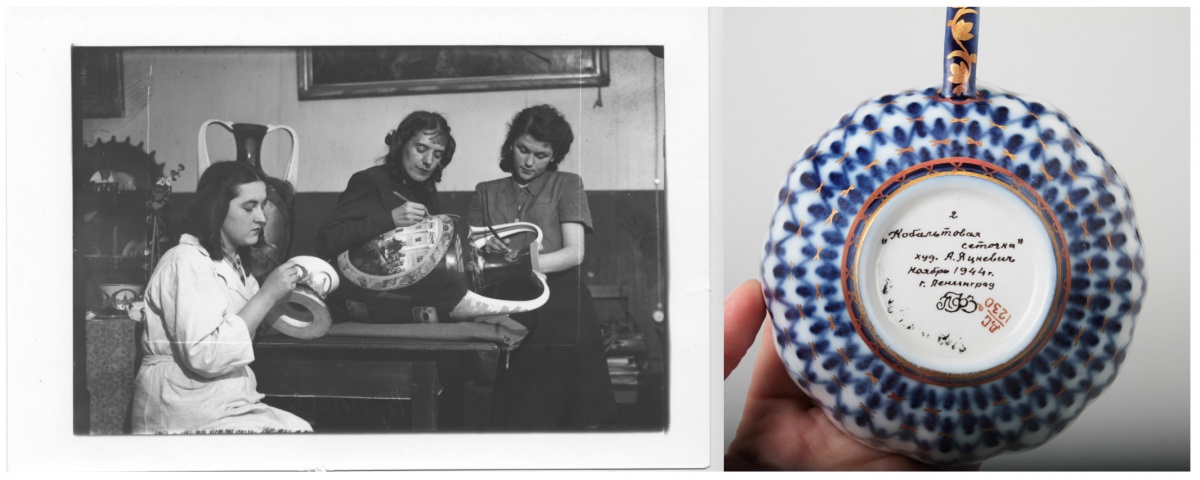 Еще один факт, связанный с Ломоносовским заводом: кобальтовая сетка – символ этого завода. Она была изобретена в 1943 году во время блокады (Прим.: Художница Анна Яцкевич, автор знаменитого синего логотипа ЛФЗ, расписала сеточкой сервиз скульптора Серафимы Яковлевой в память о заклеенных крест-накрест окнах домов и перекрестном свете прожекторов, освещавших небо блокадного Ленинграда).