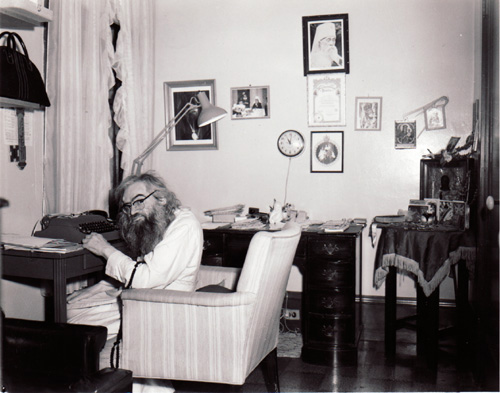 по-прежнему: в красном углу — иконы, на столе — печатная машинка, на