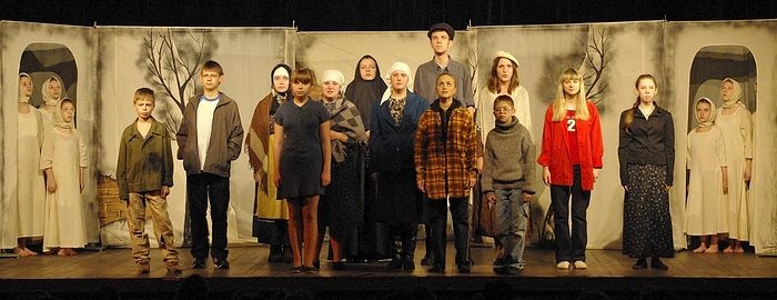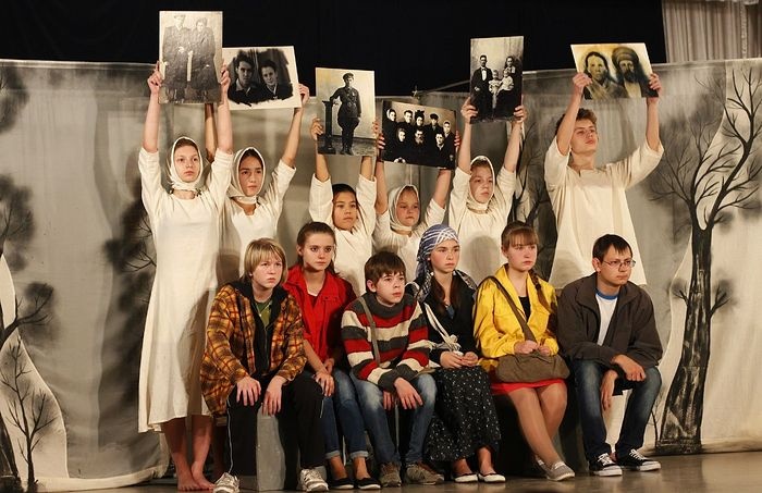 Когда я начала готовить декорации, я скачала из Интернета старинных фотографий. Вдруг моя коллега сказала: «А у меня тоже есть старинные фото: там моя бабушка, ещё младенец. Хочешь, принесу?» Я подумала: «Почему бы и нет? Кстати, и у меня есть старые фото…» Спросила у детей: оказалось, и у них есть. Вот так появились в нашем спектакле не «посторонние» фото предков из Интернета, а свои родные. Там есть фото и моего прадеда с товарищами: товарищи все из немцев Поволжья, и видно – крепкие добрые мужики….