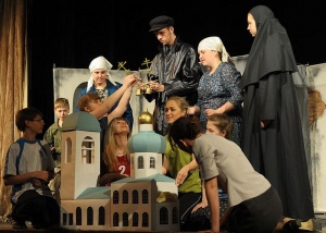 В сердце у меня! От неожиданной искренность девочки, произносящей со сцены эти слова, чувствуешь неловкость и невольно поднимаешь глаза. На написание этой пьесы автора вдохновил проект, о котором уже писал портал Православие.RU. Это история молодой женщины, которая однажды проезжала мимо разрушенного и затопленного при строительстве Волго-Балта храма на острове, вернулась домой в Москву, но уже не могла забыть увиденной церкви и стала по буквально кирпичику сама ее восстанавливать.