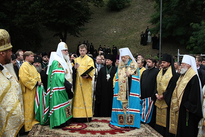 Утро дня памяти святого равноапостольного князя Владимира. Тогда безусловным эпицентром всего Киева, всей Украины была центральная лаврская площадь, где на больших подмостках служилась под открытым небом литургия. Под ногами на главной дорожке – сплошной цветочно-травяной ковер. Лаврские торжественно устлали цветами каменную кладку, по которой должен будет пройти Святейший. Эти пестрые цветочные ковры потом будут встречать Патриарха перед входом во все украинские соборы и храмы – местные приходы будут негласно соревноваться друг с другом по части изысканности таких растительных дорожек.
