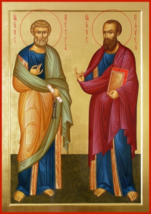 Вот мы и празднуем их день, ликуя о том, что радикальный гонитель и верующий от начала встретились в одной, единой вере о победе Христовой — Крестом и Воскресением". Апостол Петр — уроженец города Вифсаиды, брат апостола Андрея, жил со своим семейством в Капернауме и занимался рыболовством. Звали его Симоном, а имя Петр (что значит камень) он получил от Иисуса Христа. Жизнь Петра освещена в Евангельском повествовании более других апостолов потому, что он все время находился рядом с Христом, особенно сильно был привязан к Нему, первый безоговорочно верит в Божественное посланничество Господа. За это он был удостоен особой близости к Господу. Христос, утвердив Петра в апостольском звании, троекратно повторил: «Паси овец Моих». И Петр стал одним из самых смелых проповедников Евангелия. Уже в день Пятидесятницы он обратил в Христову веру сначала 5000, а потом еще 3000 человек. Петр прославился многими исцелениями, а в Иоппии воскресил из мертвых Тавифу, бестрепетно свидетельствовал о Христе перед начальниками иудейскими и судом синедриона, был дважды заточен в темницы, обрекался на смерть, но после чудесных освобождений ангелом не оставлял своего проповеднического подвига. Он побывал в разных странах Востока и Запада. Петр мученически скончался в Риме примерно в 57 году. Приговоренный к кресту он попросил распять его вниз головой, считая себя недостойным умереть, как Господь.