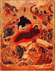 ![]() Разъяснение основных песнопений Рождества ХристоваВсенощное бдение начинается великим повечерием, на котором поется торжественная песнь пророка Исаии: С нами Бог, разумейте, языцы, и покаряйтеся, яко с нами Бог! Частое повторение в этой песни: с нами Бог! свидетельствует о духовной радости верующих, сознающих среди себя Бога-Еммануила. Тропарь, глас 4-й Рождество Твое, Христе Боже наш, возсия мирови свет разума, в нем бо звездам служащии звездою учахуся Тебе кланятися, Солнцу правды, и Тебе ведети с высоты Востока. Господи, слава Тебе! Перевод: Рождество Твое, Христе Боже наш, озарило мир светом богопознания; ибо тогда — звездам, как Богу, служившие — звездою научены были поклоняться Тебе, Солнцу правды, и знать Тебя, Восток с высоты. Господи, слава Тебе! Кондак, глас 3-й Дева днесь Пресущественнаго раждает, и земля вертеп Неприступному приносит; Ангели с пастырьми славословят, волсви же со звездою путешествуют, нас бо ради родися Отроча младо, превечный Бог. Перевод: Ныне Дева рождает Того, Кто превыше всего созданного, и земля представляет пещеру Неприступному; Ангелы с пастырями славословят, мудрецы со звездою путешествуют: ибо для нас родился Младенец юный, предвечный Бог. Стихира Слава