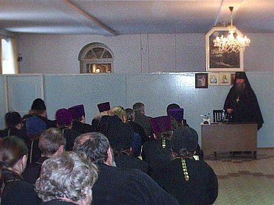 Были зачитаны тезисы из доклада Святейшего Патриарха Московского и всея Руси Алексия II на Епархиальном собрании города Москвы. Владыка Тихон дал высокую оценку доклада Святейшего, также рассказав об Архиерейском Соборе с комментариями, сделанными по личным заметкам как участника этого Собора.