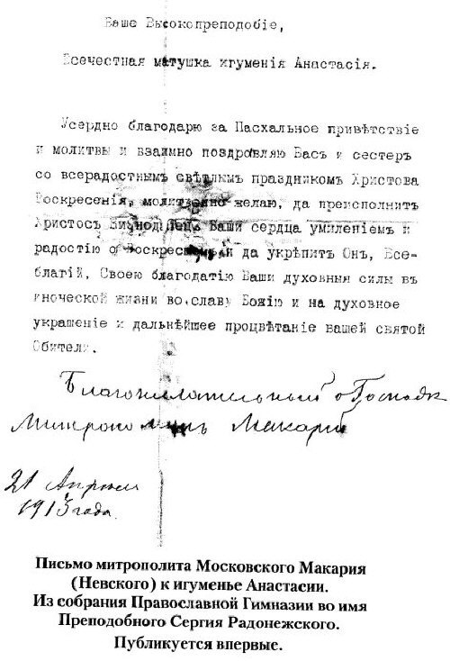 Извлечение из письма1 Преосвященнейшего Макария, епископа бийского, заведующему канцелярией епископа бийского И. Ананьевичу Возлюбленный мой И. Ананьевич! 23 марта я возвратился в Бийск, хранимый молитвами молящихся, благополучно. Томский Владыка2, епископ Томский и Семипалатинский, бывший до назначения на Томскую кафедру начальником Алтайской Духовной Миссии, посылает Вам святительское благословение.