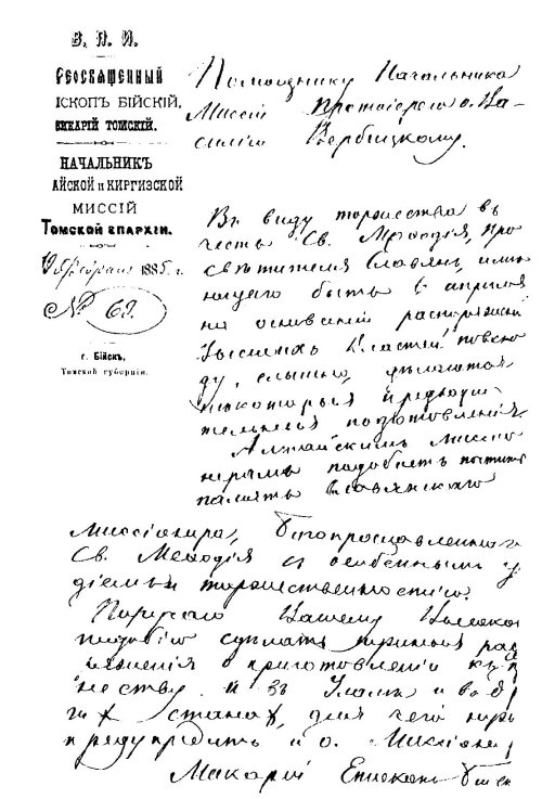Указ1 о подготовке к празднованию в Алтайской Духовной Миссии 1000-ЛЕТИЯ СО ВРЕМЕНИ ПРЕСТАВЛЕНИЯ РАВНОАПОСТОЛЬНОГО МЕФОДИЯ, УЧИТЕЛЯ СЛОВЕНСКОГО от 19 февраля 1885 г. №69 Помощнику начальника Миссий2 протоиерею о. Василию Вербицкому Ввиду торжества в честь Св. Мефодия, просветителя славян, имеющего быть 6 апреля, на основании распоряжений высших властей, повсюду, слышно, делаются некоторые предварительные подготовления. Алтайским миссионерам подобает почтить память