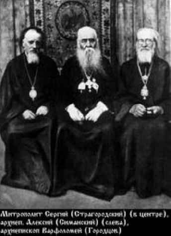 Митрополит Сергий (Страгородский) (в центре), архиепископ Алексий (Симанский) (слева), архиепископ Варфоломей (Городцев)