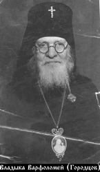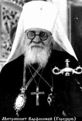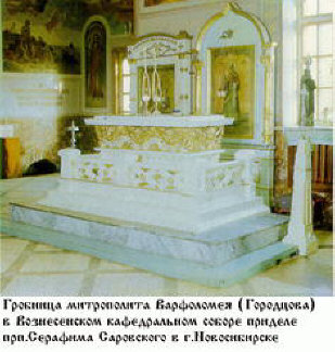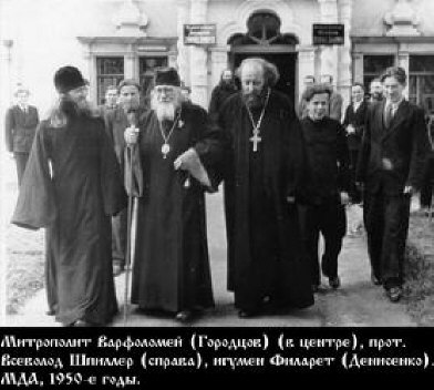 Гробница митрополита Варфоломея (Городцева) в Вознесенском кафедральном соборе приделе прп.Серафима Саровского в г.Новосибирске  Митрополит Варфоломей (Городцев) (в центре), протоиерей Всеволод Шпиллер (справа), игумен Филарет (Денисенко) (слева). МДА, 1950-е годы